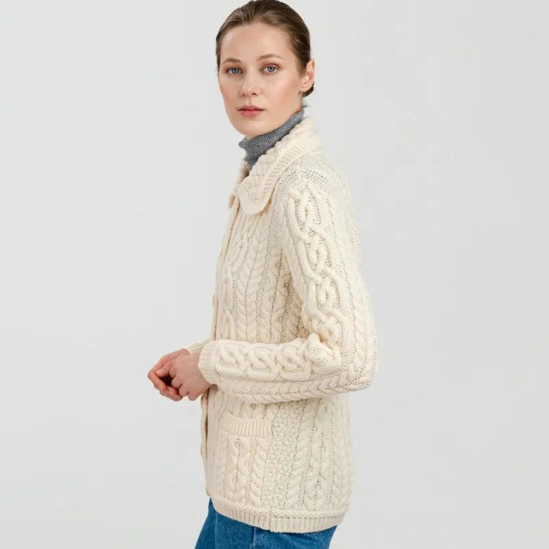 A20295 Ladies Aran Cable Knit Button Cardigan White Color SIde View  Gaelsong
