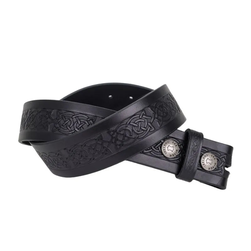 Looking to add a touch of timeless Irish flair to your wardrobe? Meet our customer favorite Eternal Knot Irish Leather Belt - a perfect blend of heritage, style, and quality craftsmanship. Irish fashion has always been about weaving culture into everyday wear, and this belt nails it. At its heart, the design boasts an intricate Celtic knotwork pattern embossed onto premium leather. Celtic knots aren't just intricate patterns - they're symbols of eternity and interconnectedness, reflecting the deep-rooted beliefs of ancient Celtic culture. With no beginning or end, these knots are a powerful reminder of life's enduring bonds. For even more Irish-style belts and buckles, check out our large selection of Celtic Belts & Buckles. Crafted from 100% leather, this belt is built to last. It's tough enough to handle everyday adventures while still looking effortlessly stylish. Over time, the leather develops a rich patina, giving it a one-of-a-kind character that only gets better in time. Measuring 1 1/2" wide, it's designed to fit comfortably. Plus, the snap closures let you easily swap out buckles for a personal touch. Handmade in County Cork, Ireland by skilled craftsmen, this belt is more than a fashion statement. Whether for yourself or as an Irish-inspired gift,, this belt brings a slice of Irish tradition to any outfit. Who wouldn't love that?