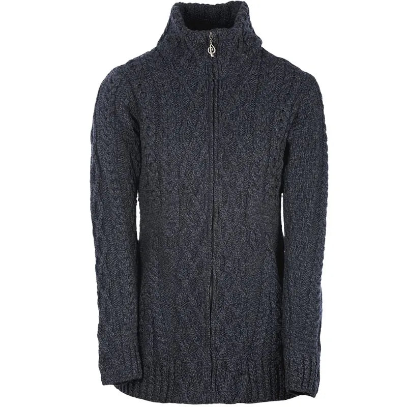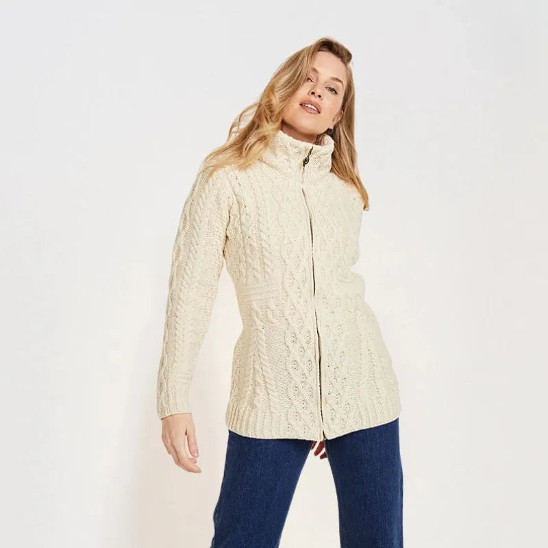 Discover Ireland's timeless knitting heritage in every stitch of our Premium Merino Long Aran Knit Cardigan. This cardigan showcases intricate Aran cable and basket stitches, a tribute to the country's rich fishing industry. The Aran cable stitch mirrors the ropes used by the brave Irish fishermen and represents strength and resilience. The basket stitch is inspired by the baskets used when fishing and reflects a wish for a bountiful catch. These textures add depth and character to the cardigan, making it a culturally-inspired addition you'll love to have in your wardrobe. Crafted from 100% superior Merino wool, this Aran knit cardigan offers exceptional warmth and comfort. Merino wool, ethically sourced from Merino sheep, is renowned for its fine fibers, which are soft against the skin and provide excellent insulation. This special wool yarn is moisture-wicking and breathable, suitable for various climates - it will keep you cozy when temperatures are down, and dry on humid summer days without overheating. Designed with long sleeves and a full zipper with a cute pull detail, the cardigan ensures versatile wear, allowing for easy layering and adaptable styling. The high collar can be worn rolled for a casual look or zipped up for extra warmth, providing flexibility. Whether you're strolling along the coast or enjoying a cozy evening indoors, our cardigan is the perfect blend of functionality and classic Irish style.
