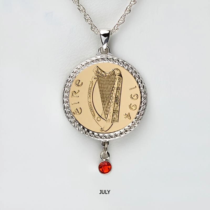 It's often said that if you find a penny and pick it up, you'll have good luck all day. Our best-selling Lucky Irish Penny Birthstone Pendant promises to be your little everyday fortune charm! Shaped and finely engraved to mirror a genuine Irish 1 penny, this pendant is as special as it gets! It features 'Eire 1994' (with 'Eire' meaning 'Ireland') and an Irish harp on the front, celebrating the country's legacy. Flip it over, and you'll discover a skillfully carved salmon fish and '1 p' lettering. Each pendant is embellished with a unique synthetic birthstone gem corresponding to each month. If you like birthstone-inspired jewelry, check out our  href="https://www.gaelsong.com/product/145941/jewelry-celtic-pendants" One Birthstone Knot Pendant and Chain as well! Crafted of a rhodium metal base, with a luxurious gold finish, this piece of jewelry will keep its durability and shine for many years to come. It's resistant to tarnish and rust, with the potential to last a lifetime. The necklace is finished with a lobster clasp closure, ensuring ease of use.