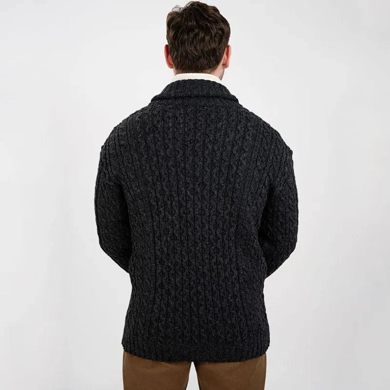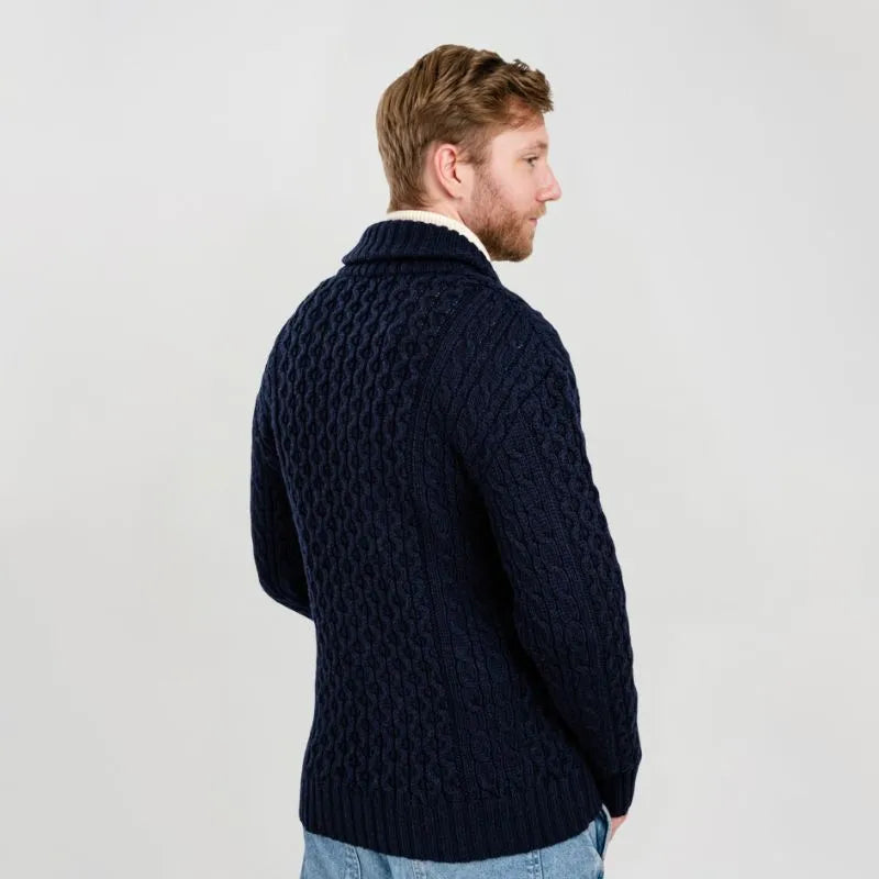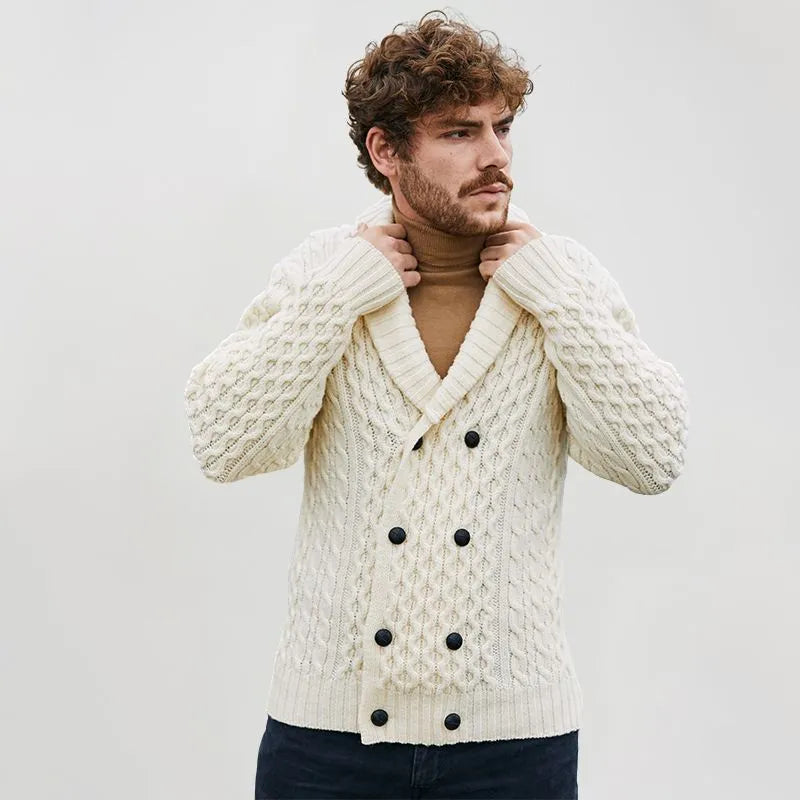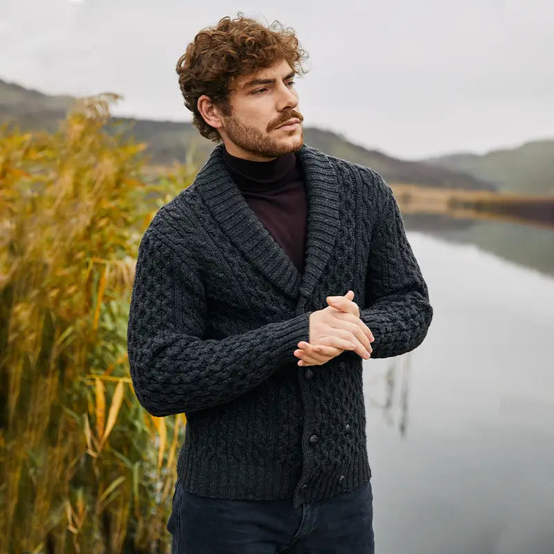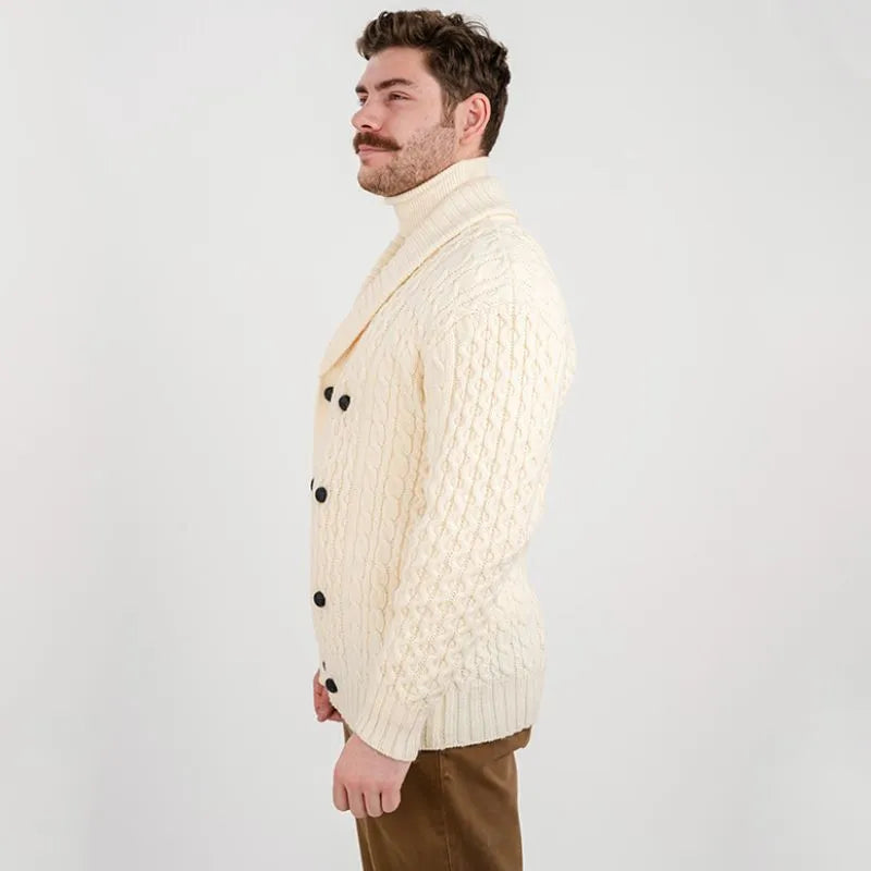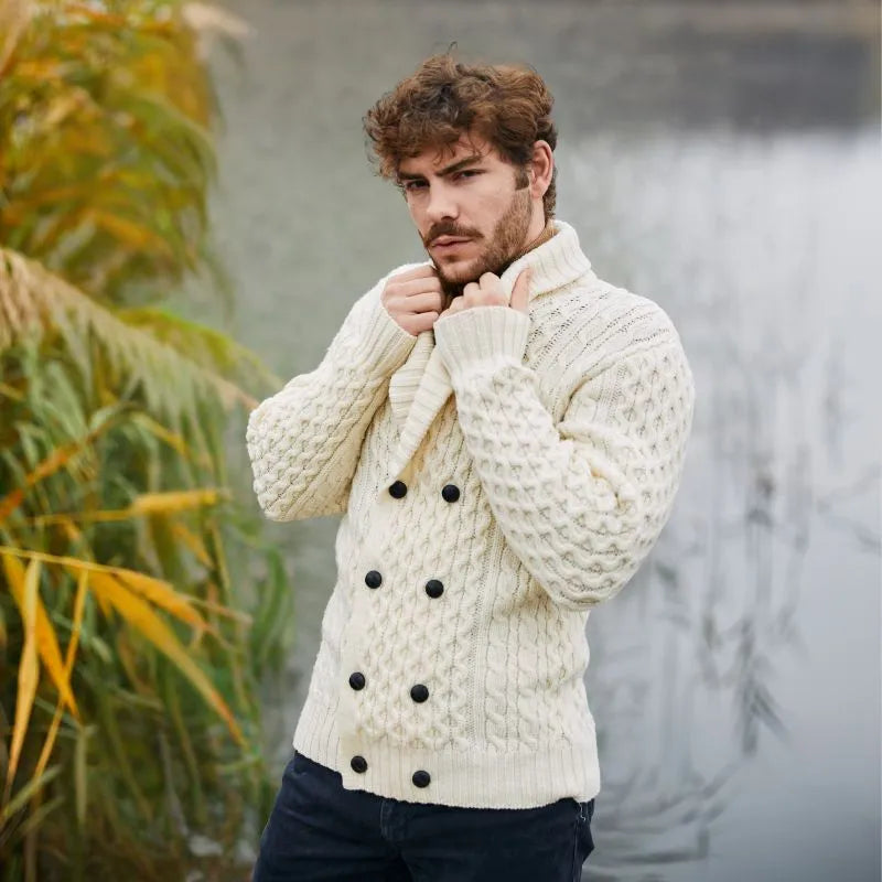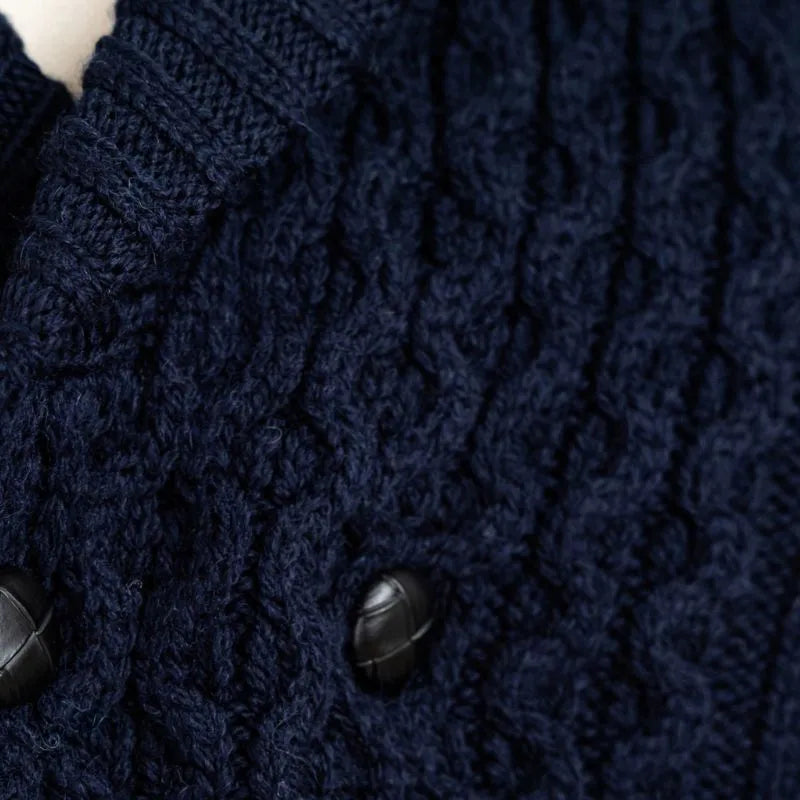 Express yourself in comfort with our gorgeous Double Breasted Shawl Irish Cardigan. Knitted of 100% merino wool, the cardigan is soft, cozy, and durable. It features a shawl neckline and 8 wooden football buttons that combine style with practicality. What makes this sweater eye-catching is its authentic Aran design featuring cable and honeycomb stitches. The cable pattern resembles the ropes used by the fishermen and represents the idea of strength and safety. The honeycomb is an ode to the prolific bee industry and symbolizes the sweet rewards that come after hard work. Please hand wash in cold water and dry on a flat surface.