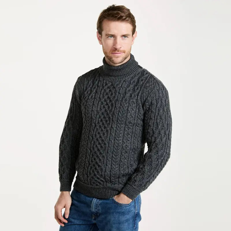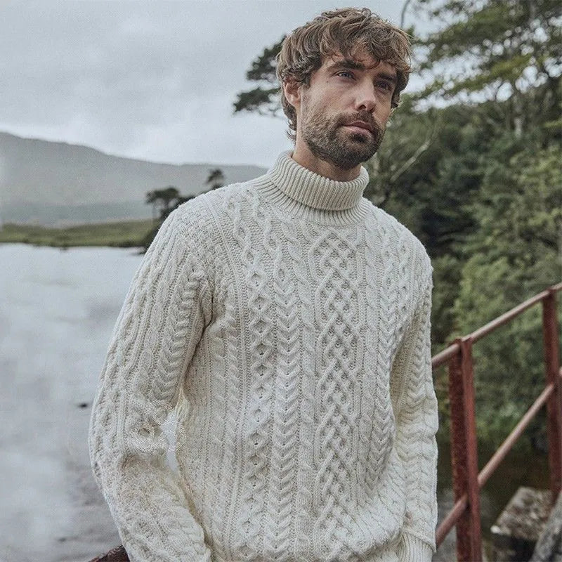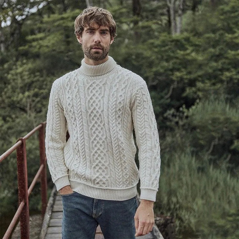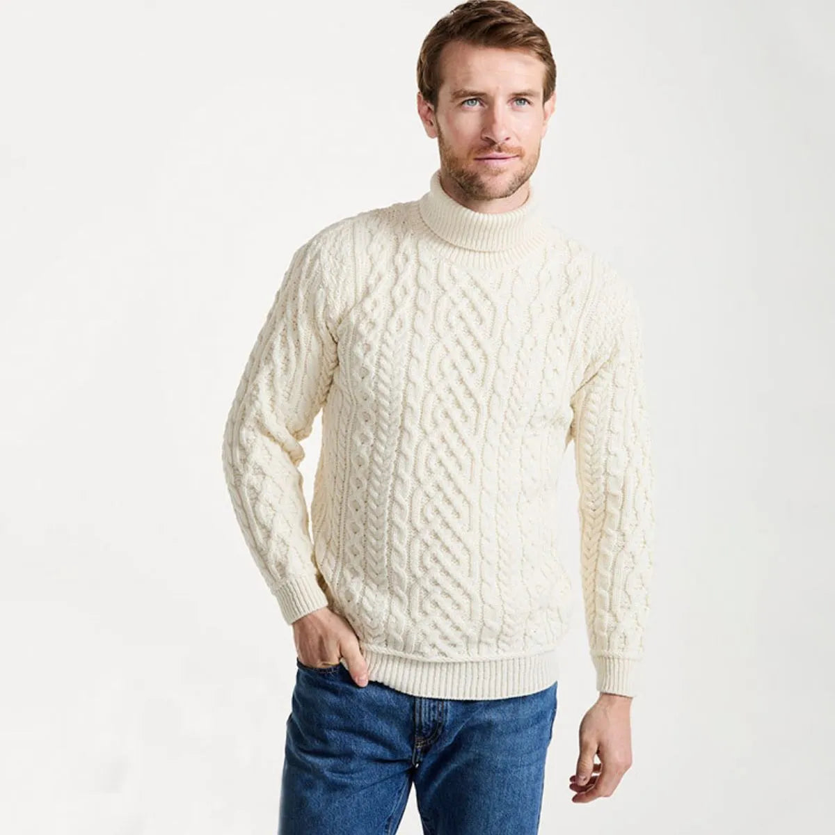 If you're looking for a timeless knitted staple piece, check out our Supersoft Merino Turtleneck Aran Sweater! This piece is crafted from 100% Supersoft Merino wool, a natural, heat-insulating material that feels incredibly smooth against your skin. Woven with centuries-old Irish knitting techniques, this sweater brings you closer to the Emerald Isle. The cable stitch, used since the 19th century, represents protection. The basket stitch is a symbol of protection, while the honeycomb pattern alludes to the industrious nature of bees. The stylish ribbed cuffs, hemline, and turtleneck adds an extra layer of coziness so you can feel snug even in the coldest temperatures. Pair our Aran sweater with a matching knitted scarf and exude elegance!Â