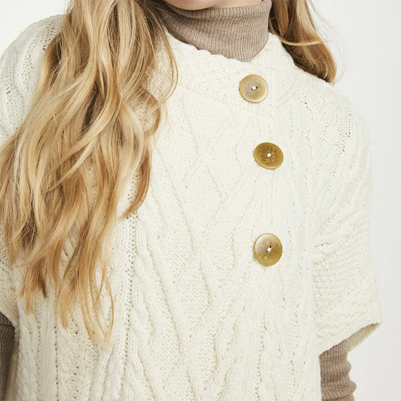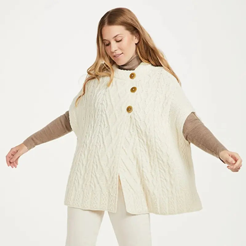 Some pieces bring warmth, style, and tradition together effortlessly - just like our Supersoft Merino Wool Aran Cape. Inspired by the classic Aran fisherman sweaters, this cape features the same iconic Irish knitting techniques that have been passed down for generations. This design showcases cable and moss stitches, both deeply rooted in Irish heritage. The cable stitch, resembling the fishermen's ropes, was believed to bring luck and protection. The moss stitch, inspired by Ireland's lush, mossy cliffs, symbolizes abundance and the rich natural beauty of the land. While today we admire these patterns for their textured, sophisticated look, they were originally crafted to provide warmth and breathability, protecting fishermen from the harsh Atlantic weather. Made from 100% Supersoft Merino wool, this cape is an even softer version of classic Merino, offering a gentle, luxurious feel against the skin. It's also heat-insulating, moisture-wicking, and incredibly durable, keeping you cozy and comfortable in chilly weather. With a crew collar, an elegant asymmetric buttoned opening, and a sleeveless cut for effortless movement, this cape is the perfect layering piece. Throw it over a crisp blouse or a cozy sweater for an effortlessly chic, timeless look. Crafted in Ireland by skilled artisans, this cape is a beautiful celebration of Irish craftsmanship and fashion. Explore our full Aran collection to find more heritage-inspired styles!