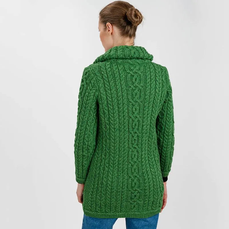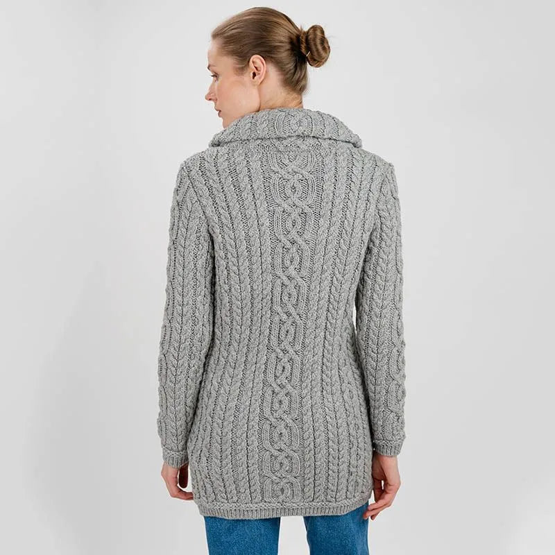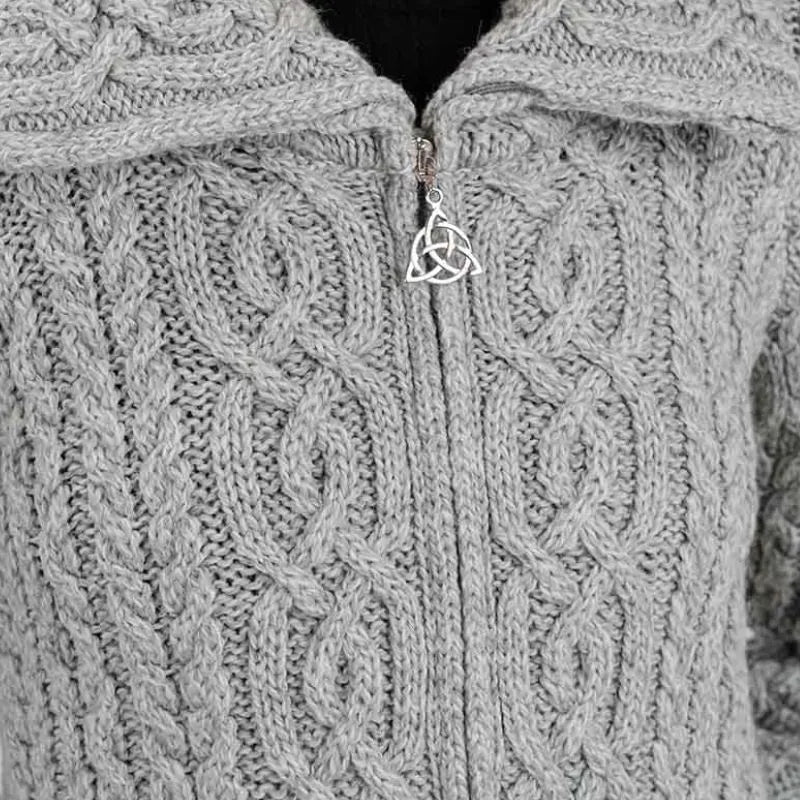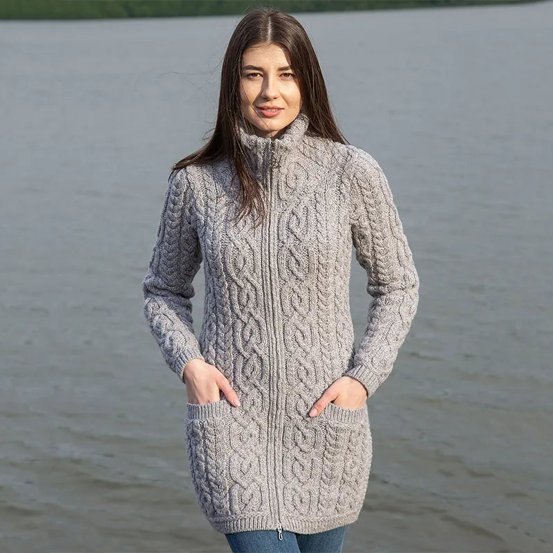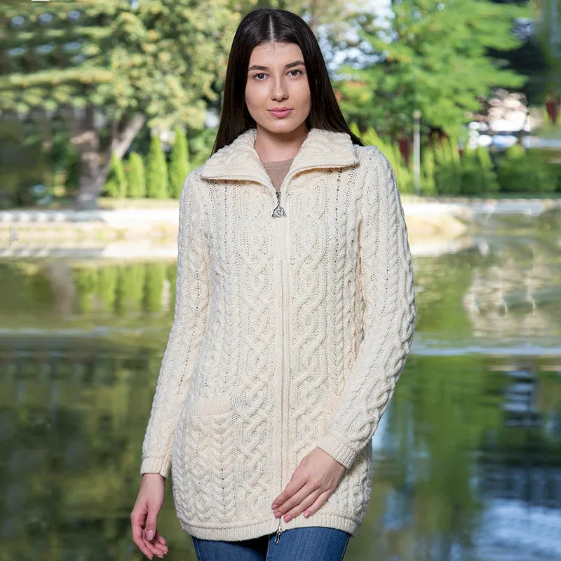 Elevate your wardrobe with this timeless Ladies High Neck Merino Aran Zip Cardigan. This cardigan is a true gem of Irish design, boasting beautiful Aran cable stitching that gives it a classic, textured look. But wait, there's more! The cable patterns are more than just decorative, they symbolize the ropes used by Irish fishermen, representing strength, safety, and good fortune.It's also packed with practical features to keep you cozy and stylish. With two front pockets for storing your essentials, a double collar to keep the chill at bay, and a Triquetra full zipper, you're covered on all fronts. The Triquetra, a three-pointed knot, stands for unity and eternity, adding a touch of meaningful tradition to the modern design.Made from 100% Merino wool, this Aran cardigan is perfect for those chilly days. Merino wool is known for being incredibly soft and warm, while also being breathable and moisture-wicking, so you'll stay comfortable in any weather. This Irish cardigan is also easy to care for and can be washed in the machine, thanks to SAOL's innovative anti-shrink technology - so you'll wear it again and again.