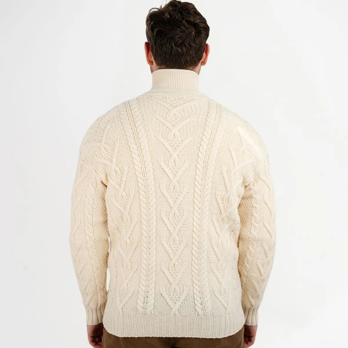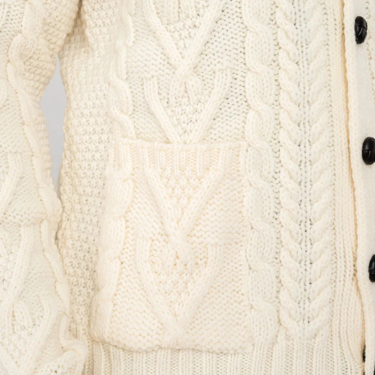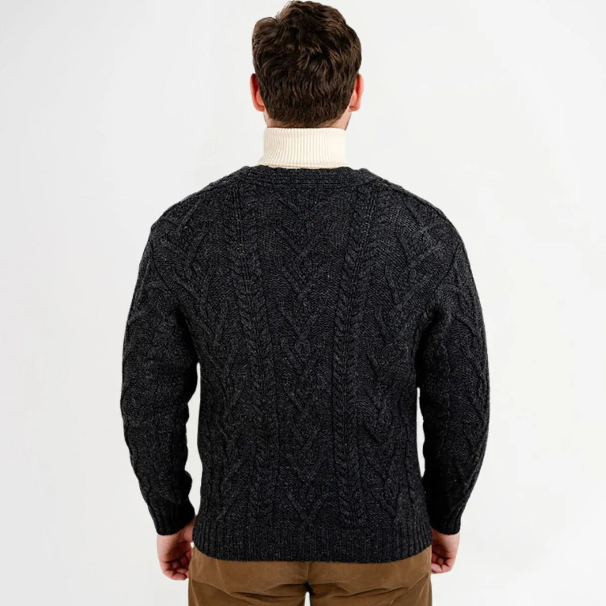 The Men's Merino Wool Button-Up Irish Cardigan is a timeless V-neck collared cardigan that is made from 100% Merino Wool, which is soft, luxurious and breathable. The cardigan features Aran stitching, which is an homage to the fishermen of the Aran Islands off the west coast of Ireland. It also features five beautiful brown buttons that offer both contrast and versatility. The front pockets accentuate the ensemble and allow the wearer to store small items or warm up their hands in case the temperature drops.