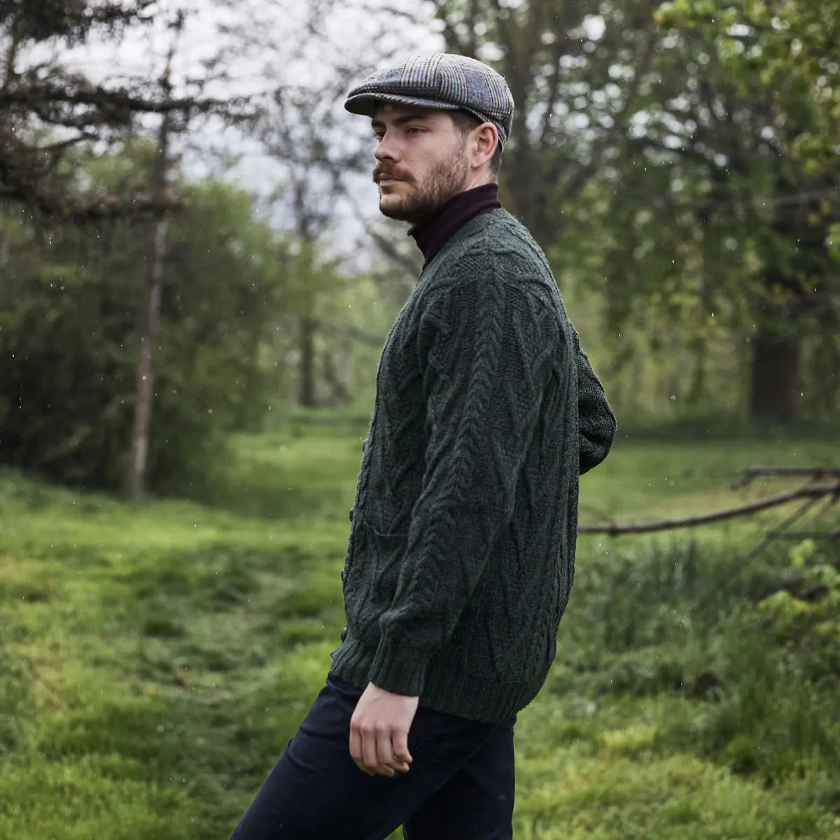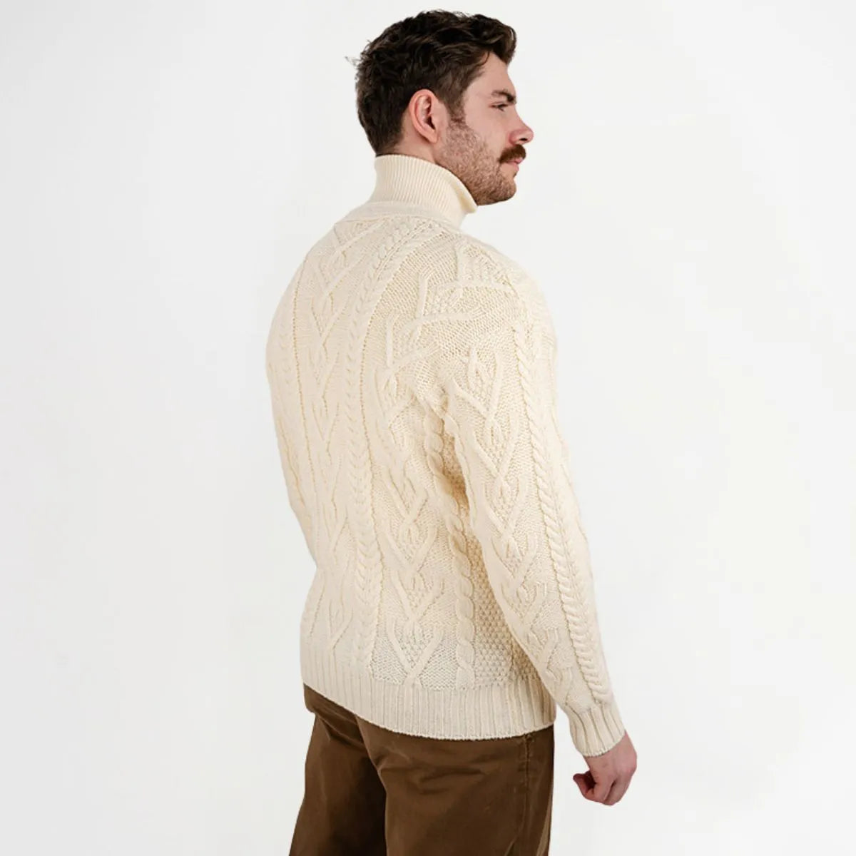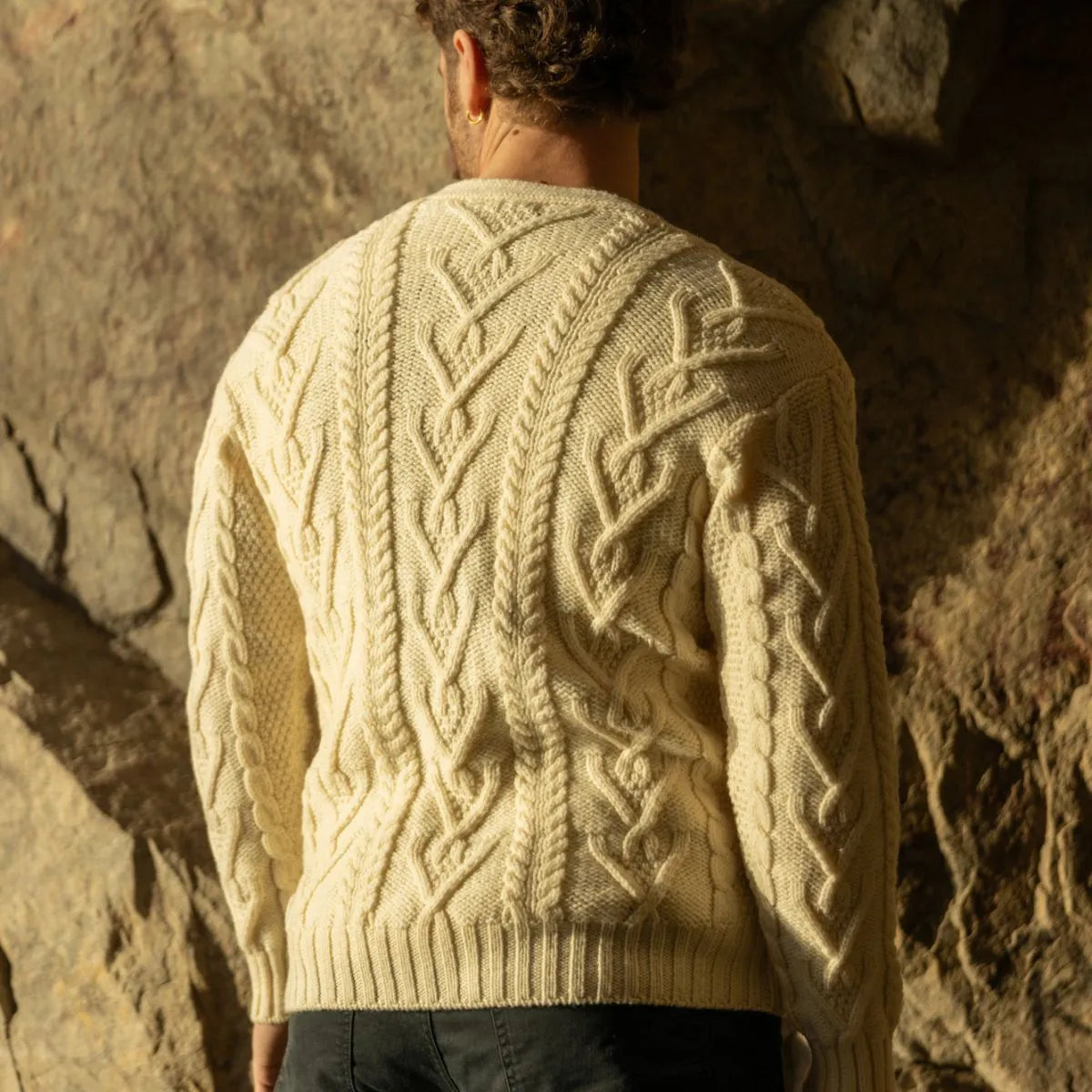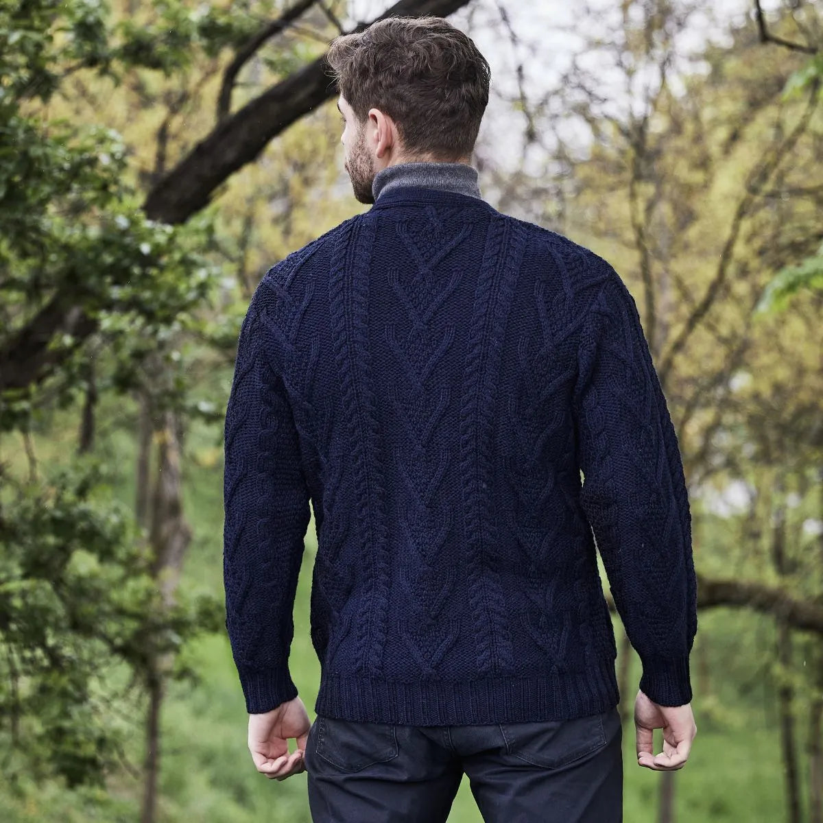 The Men's Merino Wool Button-Up Irish Cardigan is a timeless V-neck collared cardigan that is made from 100% Merino Wool, which is soft, luxurious and breathable. The cardigan features Aran stitching, which is an homage to the fishermen of the Aran Islands off the west coast of Ireland. It also features five beautiful brown buttons that offer both contrast and versatility. The front pockets accentuate the ensemble and allow the wearer to store small items or warm up their hands in case the temperature drops.