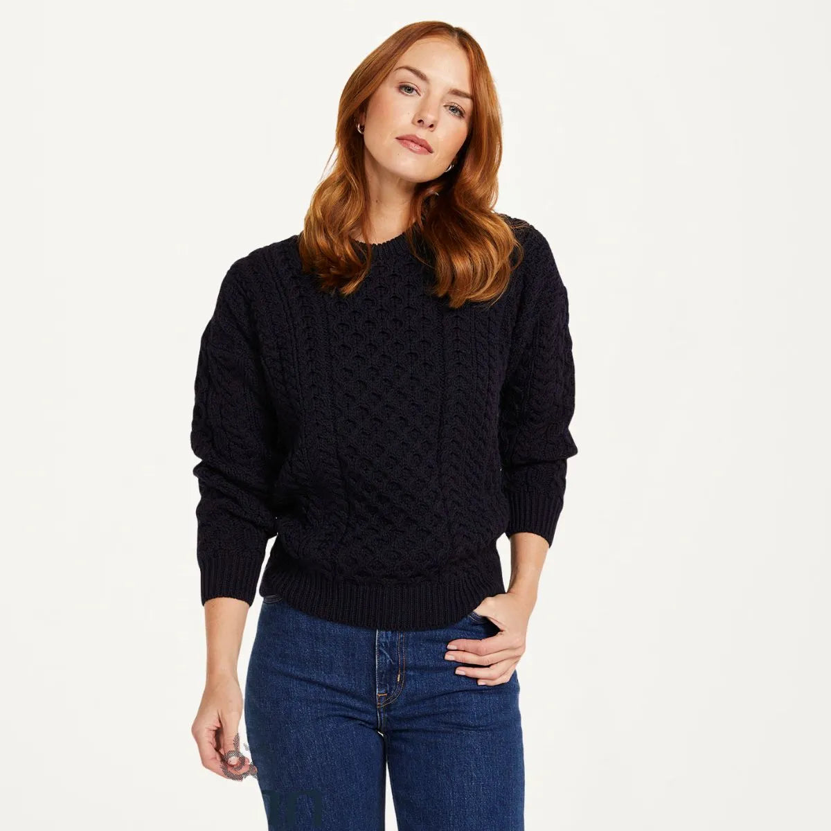 Women's Merino Crew Neck Aran Sweater Navy Gaelsong