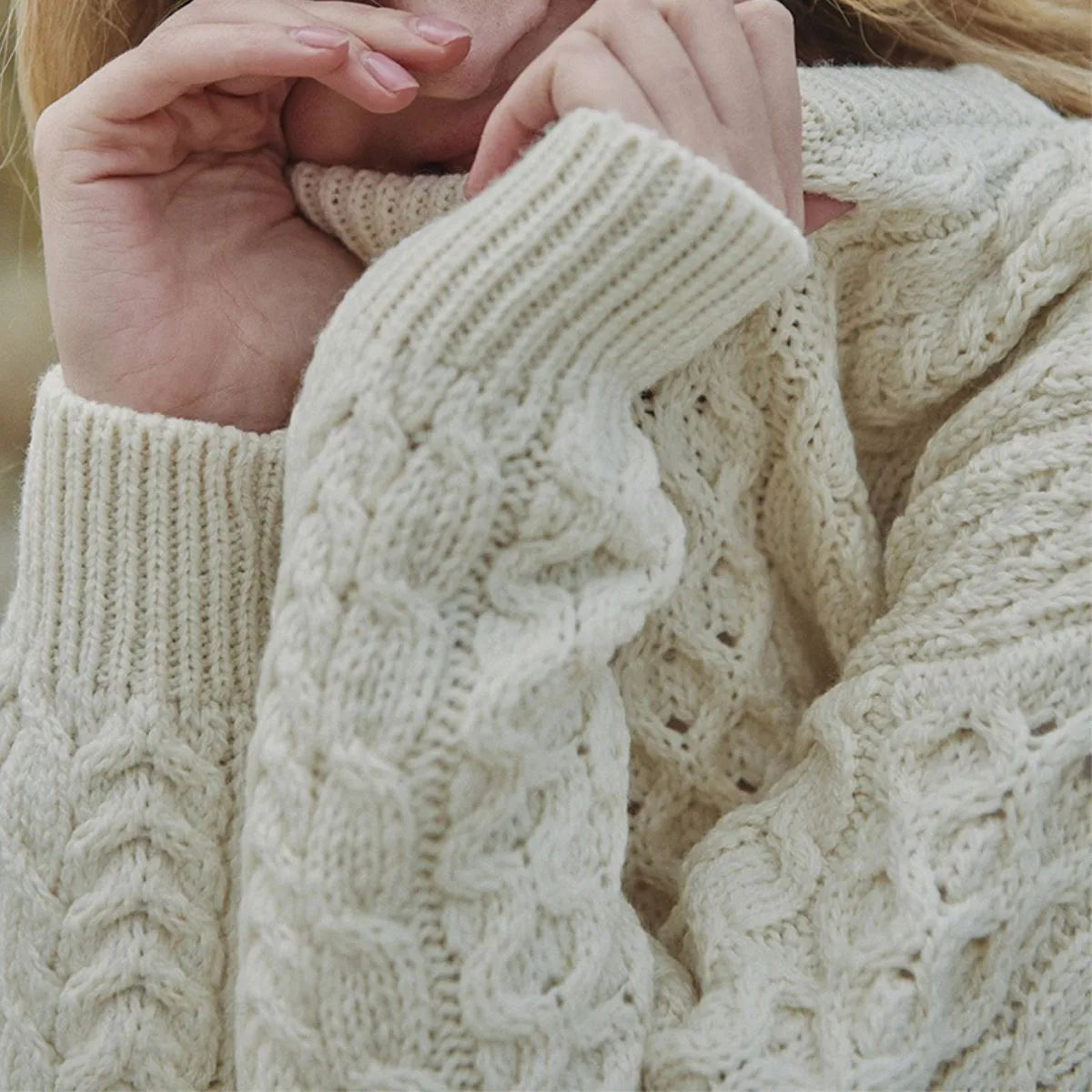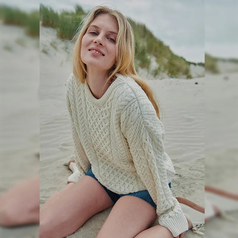 Our Women's Merino Crew Neck Aran Sweater will become your favorite piece to wear all year round! Knit of fine 100% Merino wool, this Irish jumper is soft, breathable, and durable, guaranteeing it to be in your closet for many years. Merino wool is moisture-resistant and temperature-regulating, so you can wear it both during hot summer days and cold winter weather. As a plus, it has cozy ribbing, an oversized design, and a crew neckline for added comfort. The sweater is a celebration of timeless Aran knitting traditions, featuring intricate honeycomb, cable, and basket stitches, patterns thought to bring good fortune. A unique gift for a dear one or yourself, our ladies Irish sweaters will surely impress!