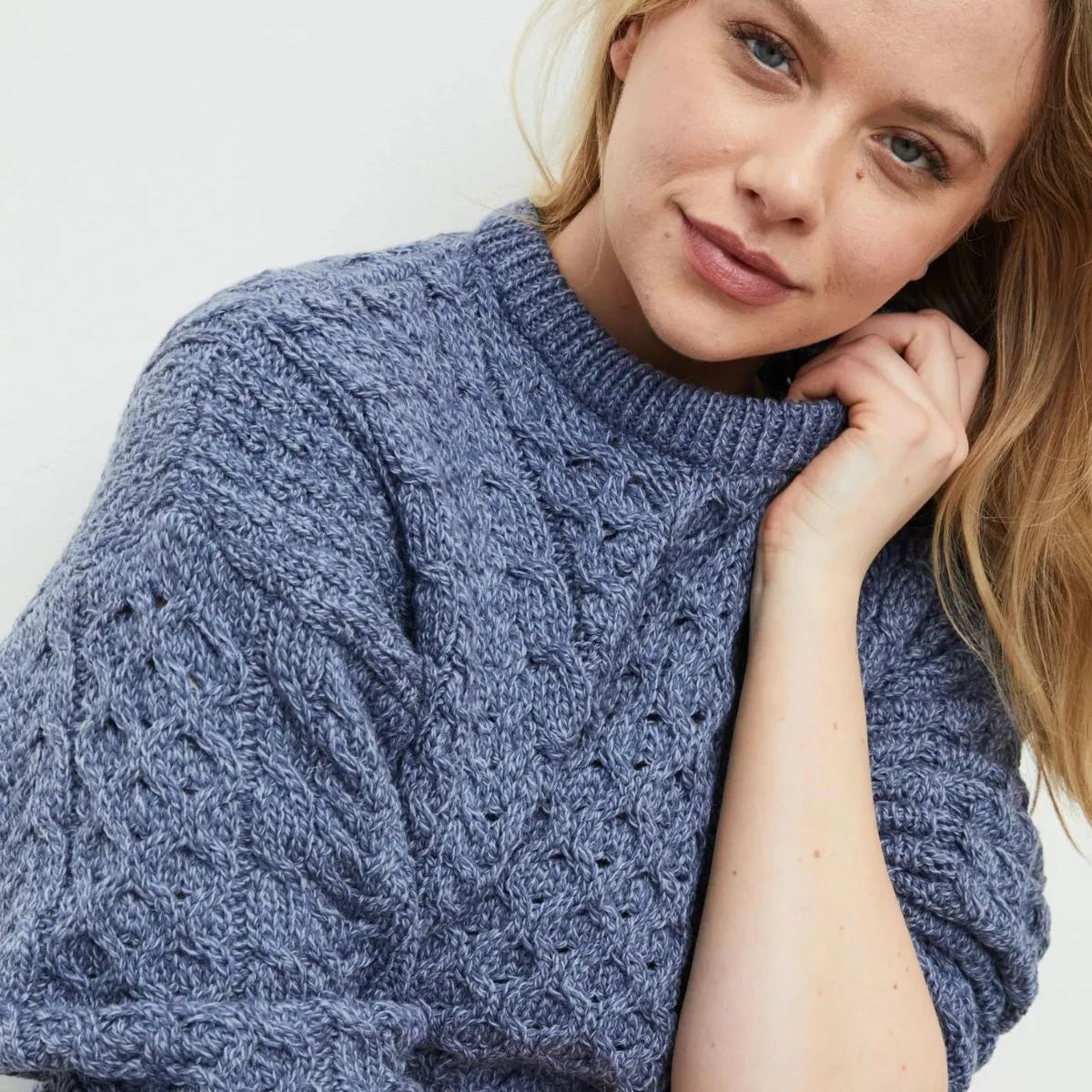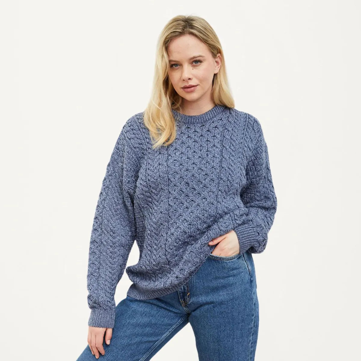 Women's Merino Crew Neck Aran Sweater Denim Gaelsong