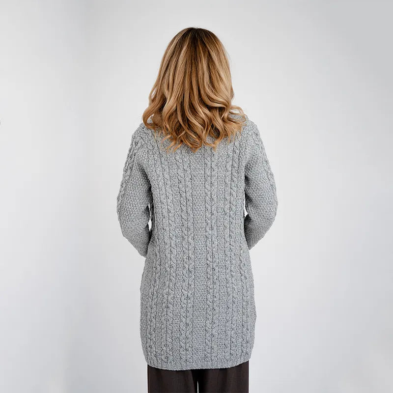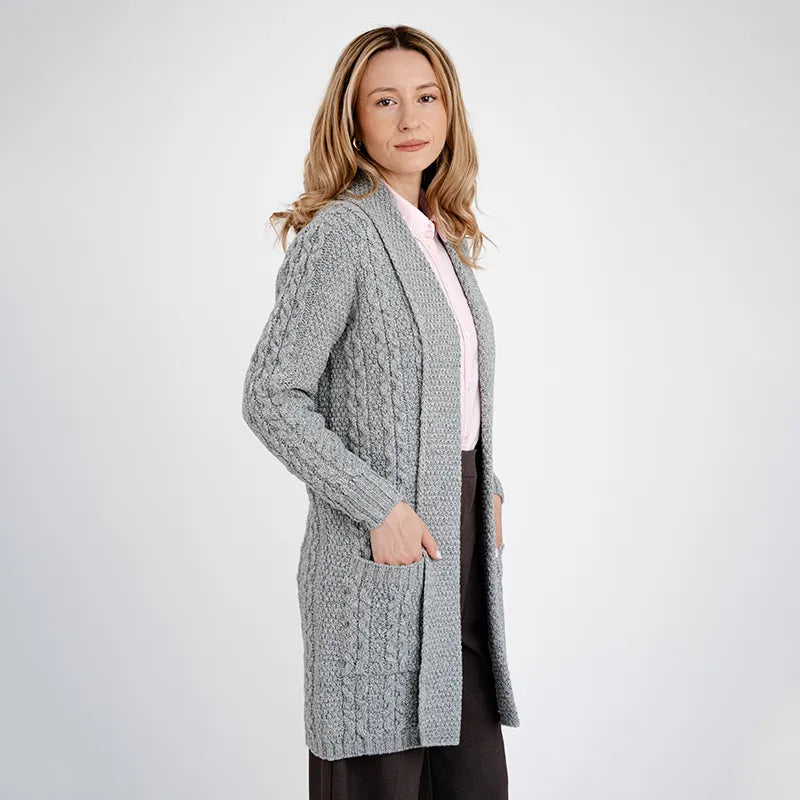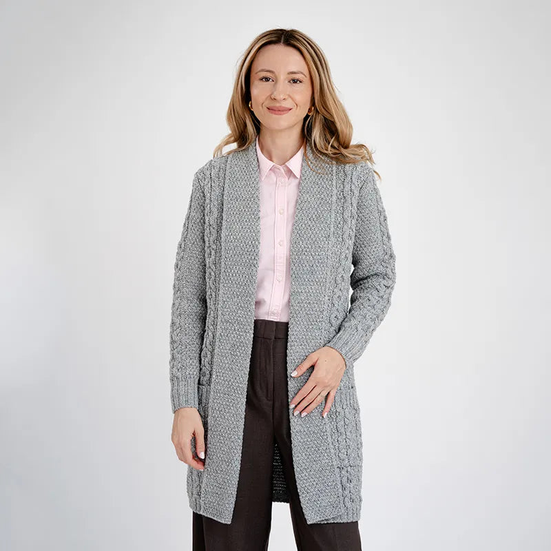 If you're after a blend of tradition and comfort, this Aran Merino Wool Open Front Cardigan is the perfect pick. The cardigan is a true classic with its cool cable and moss stitching. The cable pattern is inspired by traditional Irish Aran sweaters and symbolizes the intertwining paths of life, reflecting strength and unity. The moss stitch brings a touch of the lush Irish landscape right into your wardrobe. Made from 100% Merino wool, this Aran cardigan is all about warmth, softness, and durability. Merino wool comes from Merino sheep, known for their super fine, high-quality wool that's both breathable and moisture-wicking. It's perfect for staying cozy in any weather. Plus, it is easy to care and can be washed in the machine thanks to SAOL's new anti-shrink technology. With its long length and open design, this Irish cardigan is perfect for layering and adds a stylish flair to any outfit. Whether you're dressing up or just keeping it casual, it's a versatile piece you'll reach for again and again.Looking for a great gift? This cardigan is ideal for anyone who loves top-notch knitwear and appreciates a touch of classic craftsmanship.