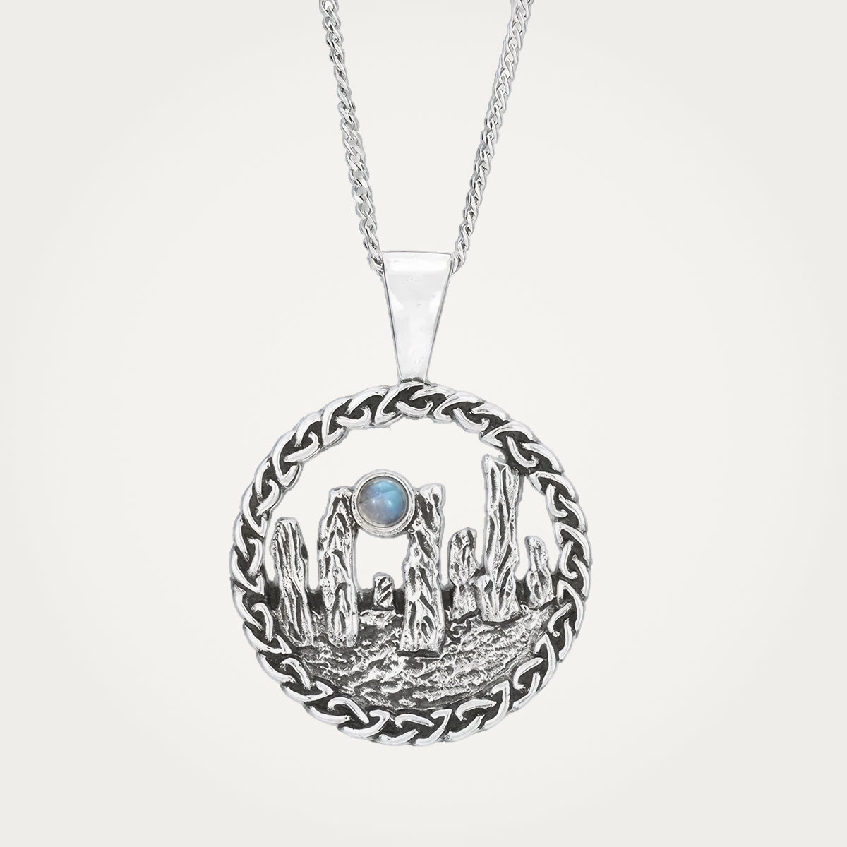 Indulge in Scotland's rich heritage with Calanais Stones Pendant with Moonstone! Crafted from 100% sterling silver, this timeless piece promises enduring wear with its tarnish-resistant nature. The blend of lustrous silver and vintage-like oxidized accents creates a striking contrast, captivating the eye. Inspired by Scotland's iconic Calanais standing stones, the "Stonehenge of the North," this Scottish pendant echoes the ancient marvels of the Isle of Lewis. The moonstone gemstone, symbolizing intuition and magic, enhances the pendant's mystery. Measuring 0.78" in diameter with an 18" chain, it is ideal for both everyday wear and special occasions.