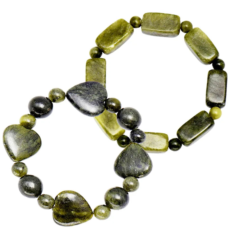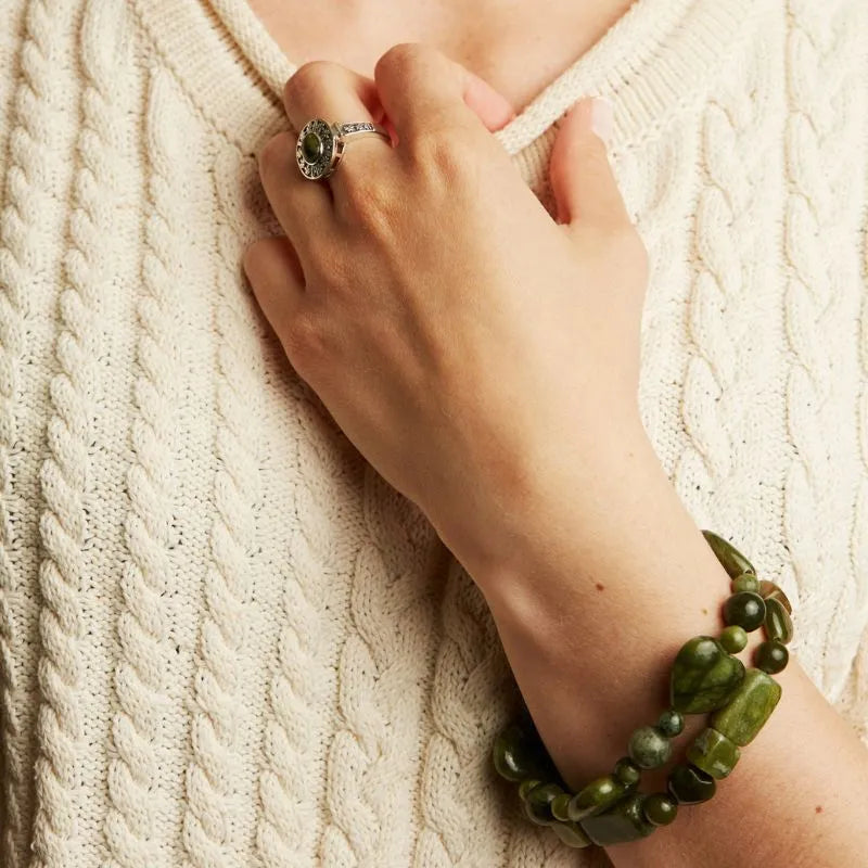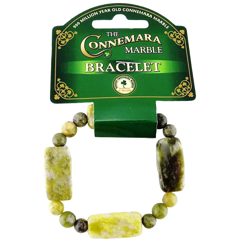 Looking for a piece of jewelry that's stylish and steeped in heritage? Check out this Nugget Style Connemara Marble Stretch Bracelet. Handmade in Ireland, it's a beautiful nod to the country's natural splendor and rich cultural heritage. Crafted from genuine Connemara Marble, which is hand-quarried and over 900 million years old, this bracelet captures the ancient charm of Ireland in each unique piece. Connemara Marble is renowned for its stunning array of colors, ranging from deep greens to soft creams and rich browns. No two pieces are alike, making each bracelet truly one of a kind. This beautiful variation reflects the natural beauty of Ireland's landscape, adding a personal touch to your jewelry collection. The bracelet showcases nugget-style beads, measuring 0.82" by 0.43"each, adding a distinctive touch of elegance. Interspersed with round beads between the elongated nuggets, it creates a visually appealing contrast. Its stretch design ensures a comfy fit for your wrists, making it perfect for everyday wear or dressing up. Whether you're looking to add a bit of Irish charm to your wardrobe or searching for a thoughtful gift, this bracelet fits the bill. It's ideal for birthdays, anniversaries, or just because you deserve something special. With its timeless design and connection to Ireland's storied past, a Connemara marble bracelet is sure to become a cherished keepsake.