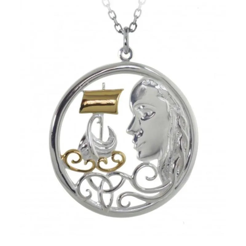 Discover the allure of The Pirate Queen Irish Necklace in Gold & Silver, a tribute to the legendary Grace O'Malley. Imagine yourself wearing this stunning piece, beautifully crafted in intricate detail & showcasing Grace herself, with her braids forming a stunning Celtic knotwork pattern, and the sail on her boat gold plated for an extra touch of elegance. Crafted from sterling silver, both the Irish Pirate Queen pendant and its matching chain boast a luxurious shine and are resistant to rust, promising to endure for generations to come. This exquisite Irish-made piece, showcasing unparalleled craftsmanship, makes an ideal Irish gift for a loved one or yourself - coming in a gift box with a story card.