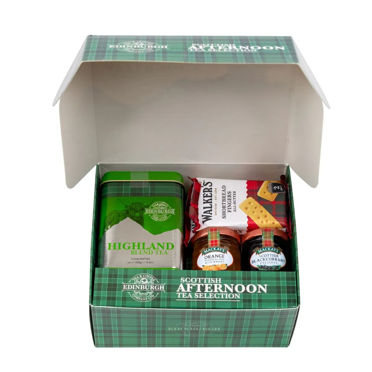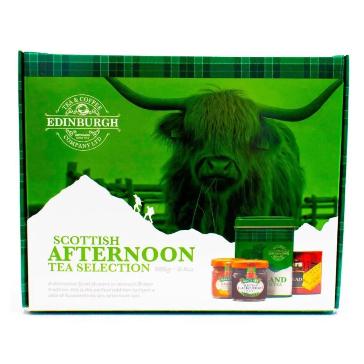 Experience the delightful taste of the Highlands with our Scotland Afternoon Tea Hamper Gift Set, the perfect treat for tea lovers and snack enthusiasts alike. This beautifully packaged set, straight from Scotland, is brimming with traditional flavors. Inside, you'll find a 4.4-ounce Highland blend tea caddy, packed with a quality blend of robust, invigorating black teas. Perfect any time of the day, this blend can be enjoyed plain or with a splash of milk. No tea experience is complete without the perfect snack. Our hamper includes a 0.84-ounce box of Walkers Shortbread Fingers, deliciously crumbly and buttery, ideal with a hot cup of tea or coffee. Adding a sweet touch, this set contains two Mackay's Jams: Orange Marmalade with Whisky and Scottish Blackcurrant Preserve. The marmalade is a zesty blend with a hint of whisky, while the blackcurrant preserve offers a unique, rich flavor. This gift set is not just a wonderful Scottish gift idea but a truly one-of-a-kind flavor experience. Packaged nicely in a sturdy box, it's perfect for those looking to impress with something different. You can choose between 4 charming variations of the same set - with added Highland cow mug (13 fl oz), matching tea bag holder (3.5'' wide), 2 packages of Walkers Shortbread Fingers, and a generously sized tin of 1.4 ounces of Scottish loose leaf breakfast tea.