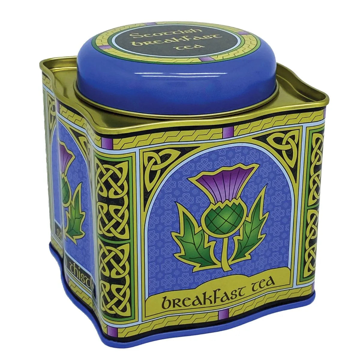 Start your day with our bold Scottish Thistle Black Breakfast Tea, a true taste of Scottish heritage! Made from the finest black tea sourced from Scotland, this premium blend offers a strong, full-bodied flavor that's perfect for breakfast or any time you need a pick-me-up. The reusable tin, featuring the iconic Scottish thistle design and intricate Celtic knotwork, adds a touch of heritage and tradition to your tea ritual, bringing Scotland's natural beauty and rich culture right into your home. The thistle, Scotland's national flower, carries deep symbolism. It's said that the thistle became a symbol of Scotland after a surprise attack by an enemy army in the 13th century, where one of the attackers accidentally stepped on a thistle, alerting the Scots to the threat. This legend represents strength, resilience, and is a reminder of how adversity can be overcome with unity and courage. The Celtic knotwork surrounding the thistle on the tin symbolizes eternity and the interconnectedness of all life. Each tin contains 50 teabags (4.40 ounces), giving you plenty of tea for multiple brews. Whether you like your tea strong and hearty or with a splash of milk, this blend offers a smooth, flavorful cup every time. The tin keeps your tea fresh but also makes a beautiful, practical storage. This Scottish breakfast tea makes the perfect gift for any tea lover. Treat yourself or a loved one to a little taste of Scottish tradition with every cup!
