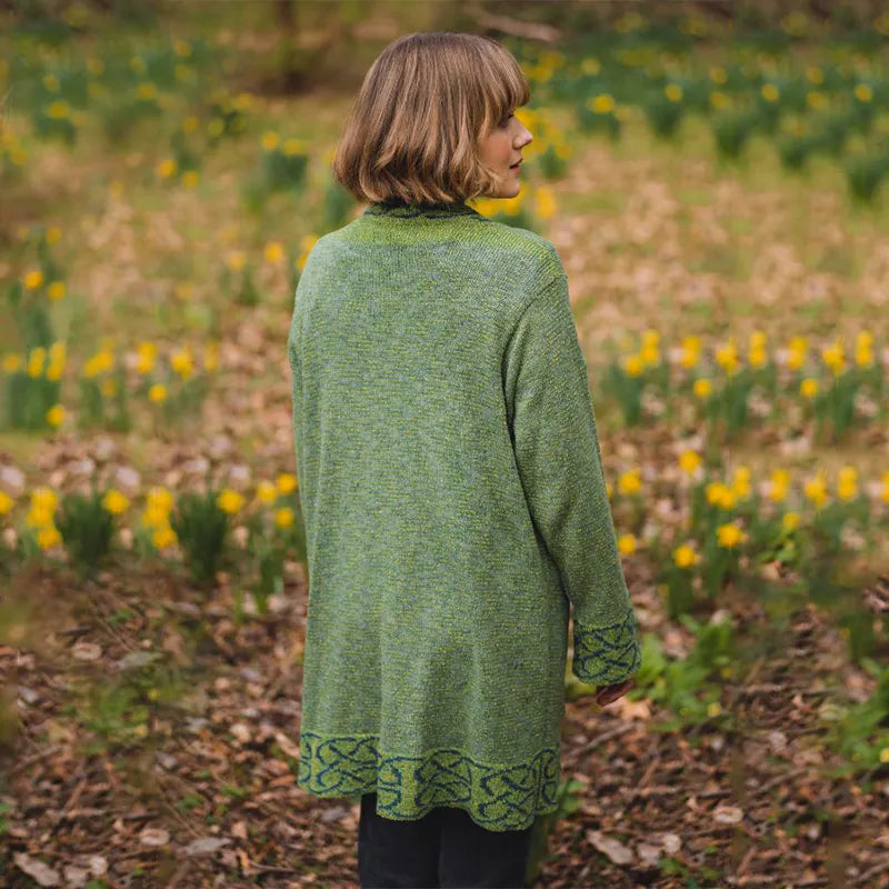 Scottish fashion is all about blending elegance with heritage, and our Silk Celtic Knotwork Mull Jacket - Scottish Green is a perfect example of that. Inspired by ancient Celtic traditions and handcrafted by skilled artisans in Edinburgh, this jacket is more than just clothing - it's a piece of culture, a symbol of timeless artistry woven into a garment you'll love to wear. Whether you have a deep appreciation for Celtic history or simply love a statement piece, this jacket brings both beauty and meaning to your wardrobe. The design is truly eye-catching, featuring bold Celtic knotwork patterns in deep blue that contrast beautifully on the rich green canvas. These intricate motifs symbolize the eternal nature of life and the interconnectedness of all things, a belief deeply rooted in Celtic culture. The speckled green canvas adds subtle pops of color, giving the jacket a dynamic and textured look. Made from a luxurious blend of silk, linen, and cotton, this jacket is soft, breathable, and lightweight, while still providing just the right amount of warmth. The relaxed fit, knee-length cut, and slightly raised neckline make it effortlessly elegant and easy to style.