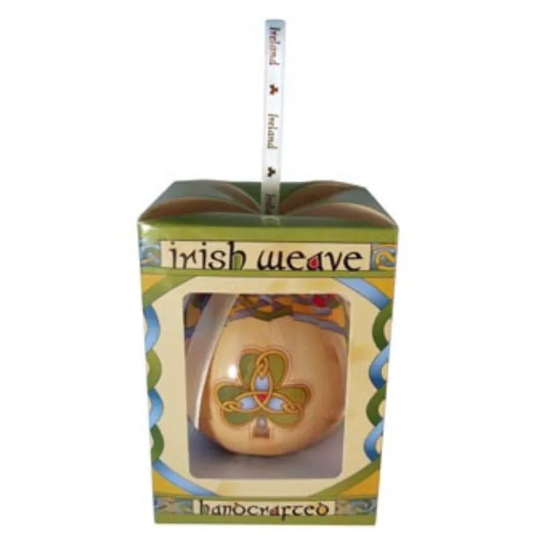 This Handmade Claddagh Ring Irish Bauble will make a sweet keepsake for your household and a wonderful memory for every Christmas! The bauble is beautifully designed as a tribute to one of Ireland's most beloved emblems, the Claddagh ring. Legend has it that, centuries ago in the Claddagh region, there was an Irish mariner who lost his wife after being captured by pirates and sold into slavery. Deeply saddened by the separation, he created the first Claddagh ring as a symbol of his never-ending love - as seen in the ring, the hands represent friendship, the heart suggests love, and the crown symbolizes loyalty. After many years, he returned home and discovered that his sweetheart had waited for him. After presenting her with the Claddagh ring, they got married and lived happily ever after. Our bauble captures the essence of that story, sure to be treasured by anyone. After all, Christmas is the season of love! The decoration is carefully handmade of papier mache, a sturdier and more durable version of the classic glass. Designed using timeless decoupage art techniques, each bauble is truly unique. Literally, no two are identical, so you'll get your own one-of-a-kind tree decoration that no one has. Spread some Irish joy this Christmas season with our Irish bauble!