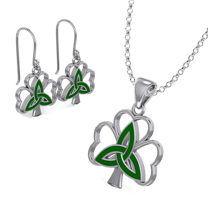 Make a statement and showcase your heritage with our Enamel Trinity Knot Shamrock Jewelry Set, complete with earrings, pendant, and chain. Crafted from 100% sterling silver, these pieces boast an enduring shine that will last for generations. The culturally inspired design merges two quintessential Irish symbols - the Triquetra and the Shamrock, both representations of the Holy Trinity in Irish Christianity. Enameling adds a vibrant green accent, enhancing their beauty. The pendant measures 0.9" and comes with an 18" sterling silver chain, while the drop earrings measure 0.62". Together, they form a  href="https://www.gaelsong.com/prod_detail_list/jewelry-celtic-earrings" stunning earrings set, suitable for any occasion, complementing your outfits with elegance and style - or a wonderful gift idea for a woman.
