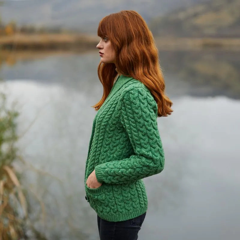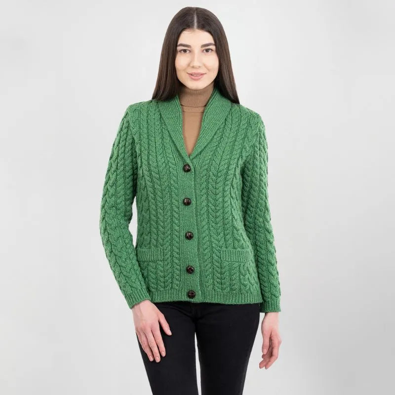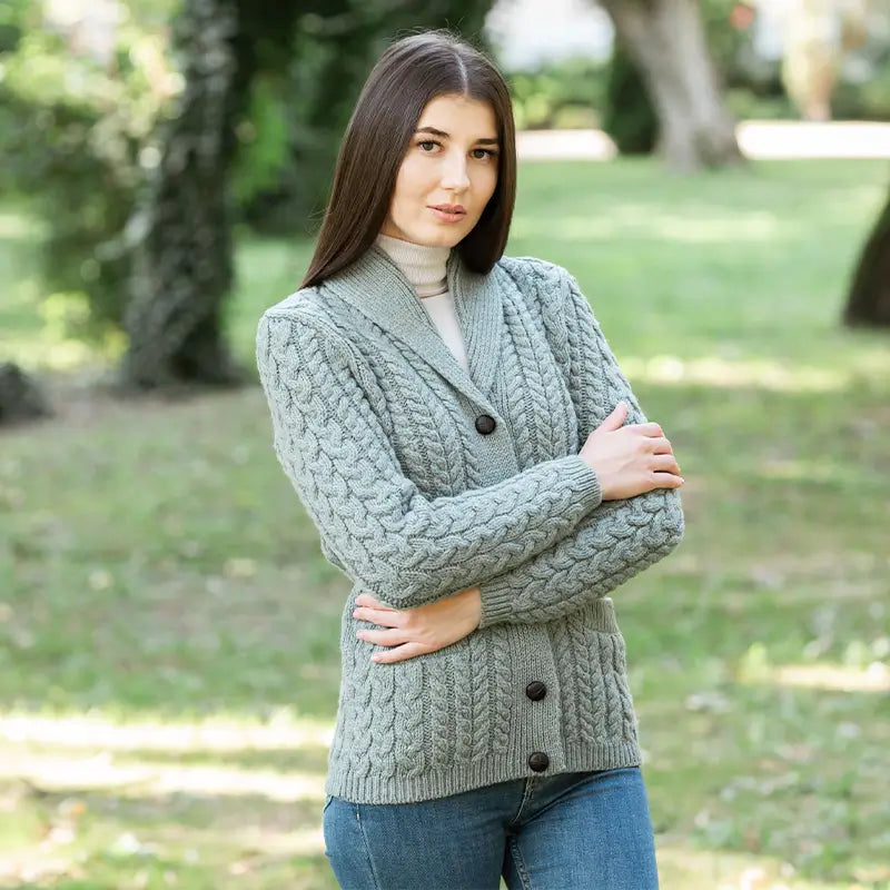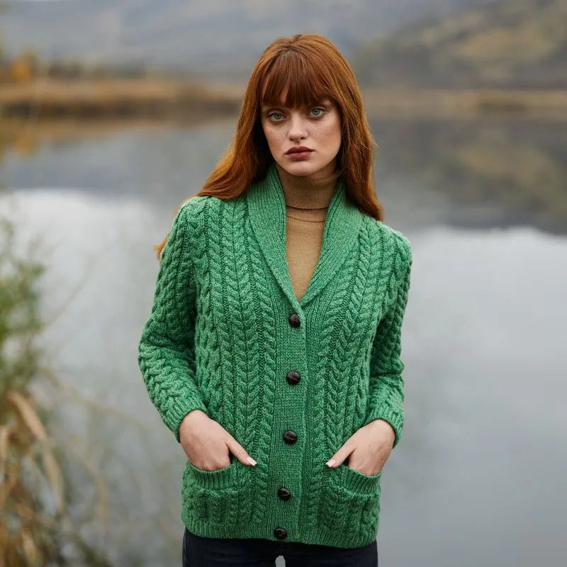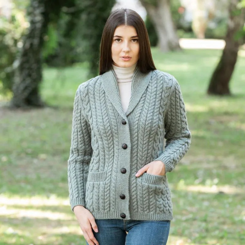 If you are looking for a beautiful piece of knitwear to elevate your wardrobe, our charming Women's Merino Shawl Collar Irish Cardigan is a great choice of style! The authentic design features Aran cable stitches and pays tribute to the bravery of Aran fishermen. The cable stitch resembles the fisherman's ropes and is thought to bring good luck and safety to those who wear them. This cardigan is made of 100% soft Merino wool, a breathable and durable material that keeps you comfortable all day long. Merino wool is lightweight, moisture-wicking, heat insulating, and incredibly soft, so it'll keep you warm when temperatures drop and dry in hotter weather. It's perfect for chilly days or layering over your favorite outfits for that added Irish charm.The best part? Its SAOL's machine-washable innovative technology makes it easy to care for! The cardigan is knitted with a shawl collar that allows layering over different types of clothing and provides extra warmth. With ribbed cuffs and hem, this cardigan offers a snug fit that keeps you cozy. The functional wooden football buttons add a traditional touch, while the pockets bring extra practicality. Whether you're out for a relaxed day or curling up at home, this cardigan has got you covered. Ready to complete your look? Don't forget to check out our collection of scarves, hats, bags and gloves to stay warm in Irish style all season long!