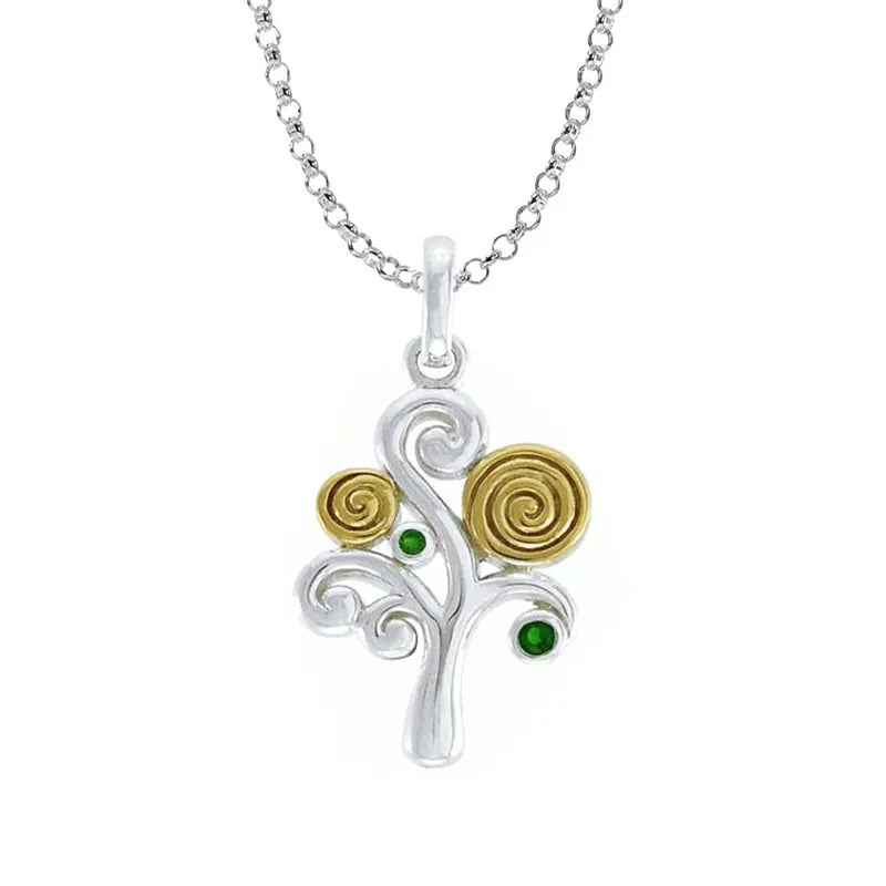 This enchanting Spiral Celtic Tree of Life Pendant harmoniously blends tradition and modernity, exuding timeless elegance. Meticulously crafted from 925 sterling silver, adorned with a lustrous 14K gold vermeil accent, it radiates sophistication and durability. At its heart lies the iconic Celtic Tree of Life, symbolizing growth, strength, and interconnectedness. Enhanced with delicate emerald glass accents, the pendant captivates with its vibrant allure. Measuring approximately 0.66 inches width x 0.98 inches height with an 18-inch chain, it is versatile and practical. Whether worn as a personal talisman or gifted as a token of affection, this pendant serves as a reminder of the enduring cycle of life and the interconnectedness of all things.