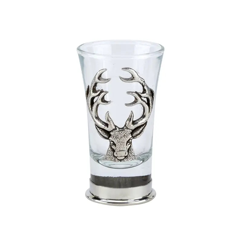 Our Embossed Pewter Stag Shot Glass makes for the perfect gift for any lover of Scottish and Celtic culture and anyone who can hold their liqueur. This product is made of very durable glass and has pewter detailing, making sure it's resistant and will last for a long time. It features a handcrafted stag design. The Highland stag is a revered element of Celtic culture, a symbol of power and nature's renewal. In Celtic mythology, the stag represented the power of the Other World. Holding 2 oz, our Scottish Glass is the best way to down your preferred drink.
