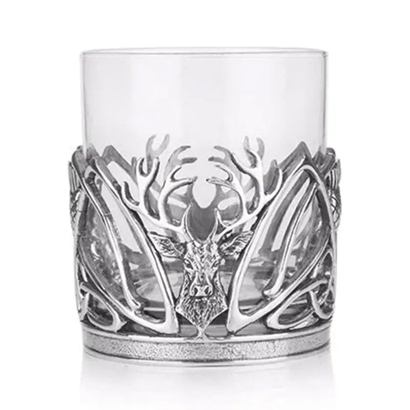 Whether you're enjoying a neat pour, a classic whisky cocktail, or you are planning a tasting session with friends, our Whisky tumbler provides a sophisticated vessel to enhance your whisky-drinking experience. The tumbler is a stunning piece crafted from premium-quality glass and pewter, materials that add elegance, making it a standout piece for whisky enthusiasts. Measuring approximately 2.95 inches x 3.3 inches (approximately 7.5 cm x 8.5 cm), the tumbler is compact and designed for a comfortable grip. Its size allows for a generous pour of your favorite whisky. With its pewter stag and thistle design, this whisky tumbler is not only a functional and practical choice but also a visually striking piece that adds a touch of Scottish heritage and elegance to your barware collection.