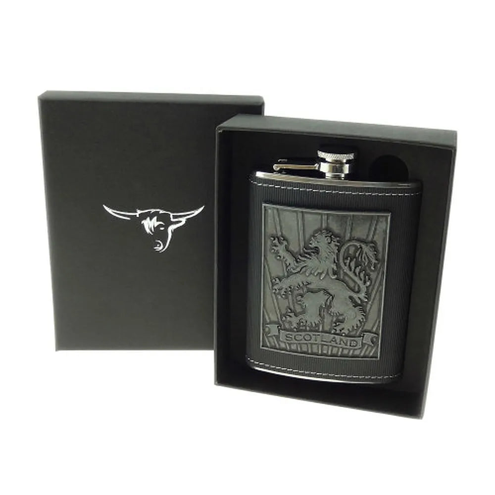D68651 Steel Whiskey Flask with Scottish Rampant Lion Design Box Gaelsong
