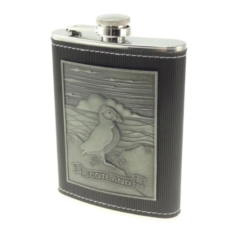 D68651 Steel Whisky Flask with Scottish Design Puffin Gaelsong