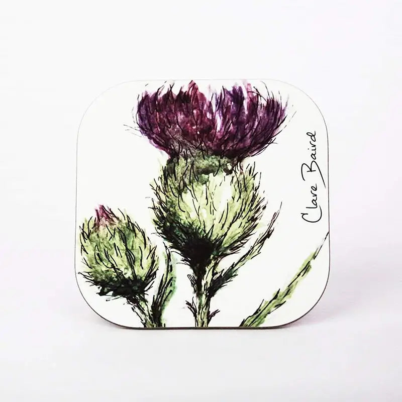 Decorate your kitchen in a unique way that honors Scottish heritage with our Thistle Flower of Scotland Coaster Set of 2. The coasters are made out of hardboard and they have a glossy coating for extra durability and a shiny look. They are designed by the brand Clare Baird with an elegant Scottish Thistle, on a white background. The well known symbol of Scotland is drawn in shades of dark green and deep purple and has black details that give it a more luxurious look. Coming in a set of 2, they are perfect for being displayed on a coffee table, making them a decoration, but also a practical item. They measure 10x10cm each and they are produced in Scotland, which gives them a plus of authenticity.
