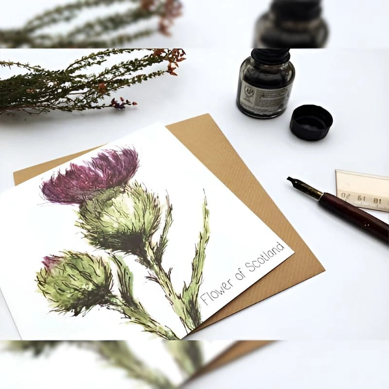 If you are looking for a gift card or just a nice illustration for your office desk, this beautiful card might be just what you need. The design features an intricate and vividly colored watercolor illustration depicting a Scottish thistle. The thistle is a Scottish symbol with an interesting and unique history which makes it deeply significant in Scottish culture. This lovely prickly flower was faithfully rendered in this illustration and this makes this card a great Scottish gift card for a special occasion or just a nice illustration for yourself. You can leave the card blank inside or add a special personalized message.