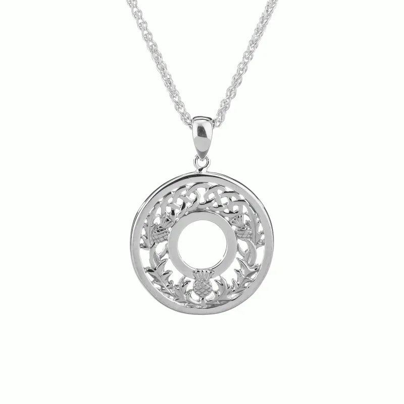 Discover the epitome of Scottish heritage and elegance with our The Flower of Scotland Thistle Pendant. Meticulously crafted from oxidized sterling silver, this Scottish pendant boasts a timeless allure coupled with remarkable durability, ensuring it remains a cherished piece for generations. Adorning the pendant is the iconic Scottish Thistle, symbolizing bravery, courage, and the resilience of the Scottish people, intricately entwined with Celtic knotwork, representing eternal life and interconnectedness. With dimensions of 1"x1.37", this exquisite pendant is perfectly complemented by an 18-inch chain, making it an ideal gift for those who appreciate the rich cultural heritage of Scotland.