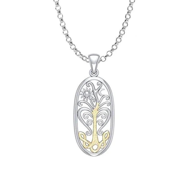 Our stunning pendant is meticulously crafted from .925 Sterling Silver with a touch of luxury in its 14K Gold Vermeil accent. Inspired by the motif of the Tree of Life, this pendant showcases intricate silver branches, complemented by a radiant sun and moon above, and a golden tree trunk and roots at the center. With a height of 1.1 inches, it is ideal for both everyday wear and special occasions. This pendant effortlessly combines elegance and nature, making it the perfect gift for anyone who appreciates its meaning, and a timeless addition to any jewelry collection.