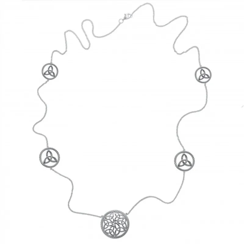 Celebrate Celtic heritage through your accessories with our Silver Sacred Trinity Knot Necklace! This piece is designed with multiple encircled Trinity knots that will beautifully hang around your neck. Did you know that Trinity knots are deeply rooted in Celtic symbolism? They represent the eternal connection between all things in the universe, as well as the Holy Trinity in Irish Christianity. We authentically crafted this necklace in Ireland, from durable, rust-resistant sterling silver. Plus, it's the lustrous appearance is sure to elevate your look. You can style this piece over blouses, too, since it measures 28" in length. It's a one-of-a-kind addition to your collection!