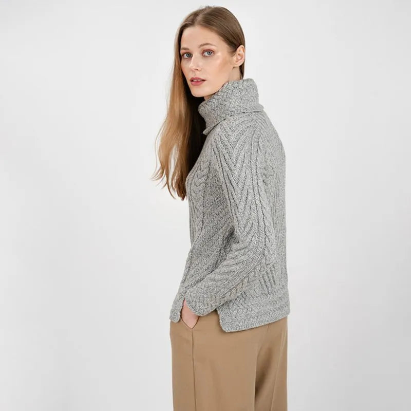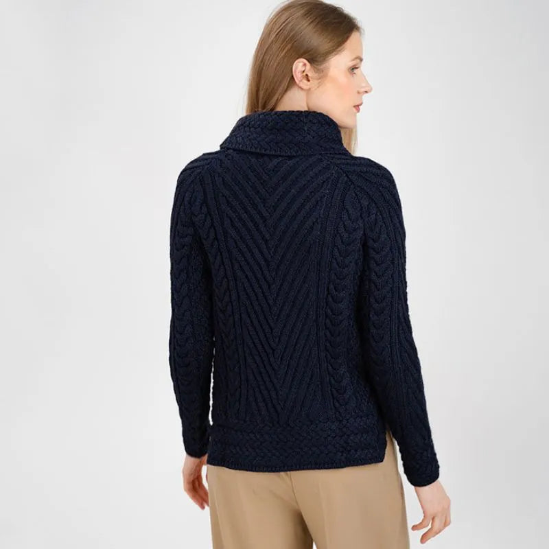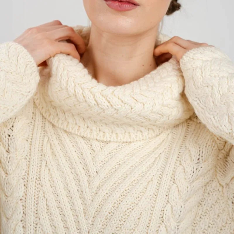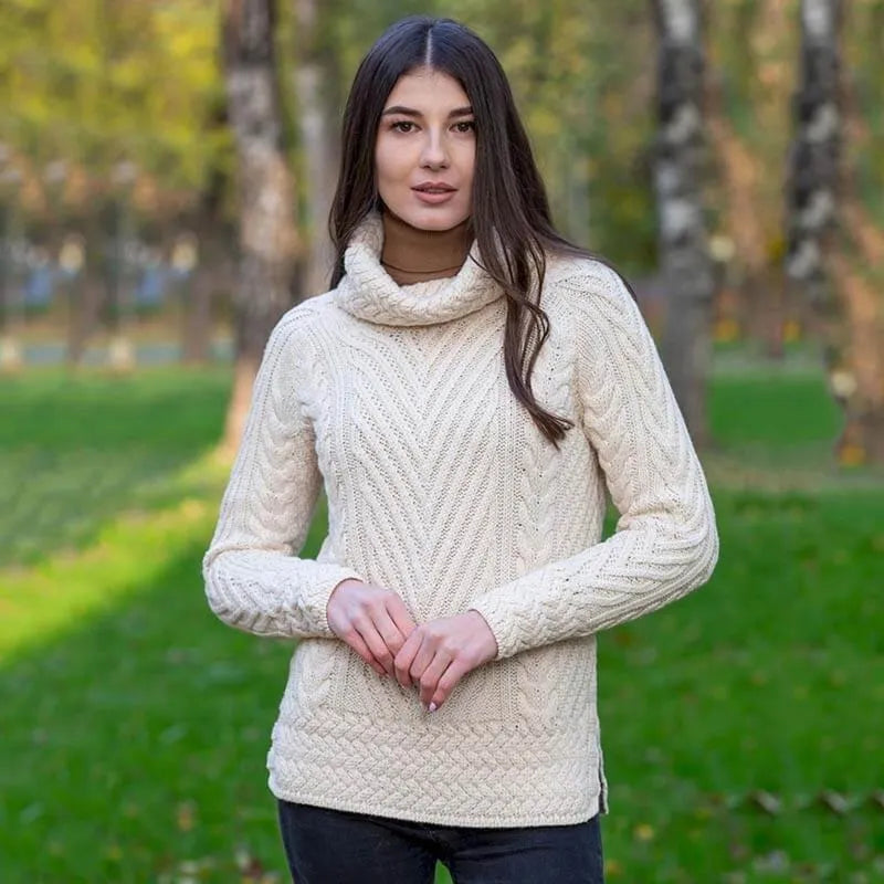 Wrap up in Irish style and comfort with our beautiful Women's Traditional Merino Wool Blend Sweater! Did you know that the Aran patterns on this sweater draw inspiration from the age-old Irish pieces that your ancestors used to wear? Centuries ago, the Aran islanders found the perfect way to fight off the cold temperatures. You've guessed it right - knitwear! These cool guys knit stitches onto different knitwear pieces as an extra layer of warmth and protection against harsh conditions. But wait, there's more to the story. These stitches are unspoken blessings of good luck and safety. The sweater is made of Merino Wool blend, an upgraded type of regular wool, much softer and lacking the wool's usual itchiness. Merino Wool is warm, retaining body heat, but also allows breathability and is moisture-kicking, thus providing the ultimate all-day comfort. This is the perfect piece that will come in handy during chilly days of spring and summer or cold winter days - it's ideal for all year round. This charming piece is designed in a classic, timeless format, with a modern twist, featuring chic side slits. You can adjust the oversized collar according to your preference. Cool, right?