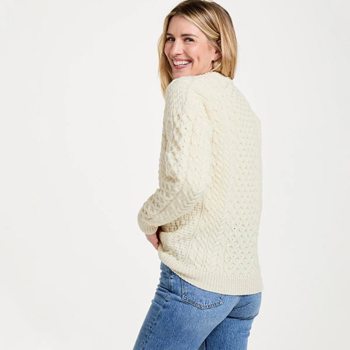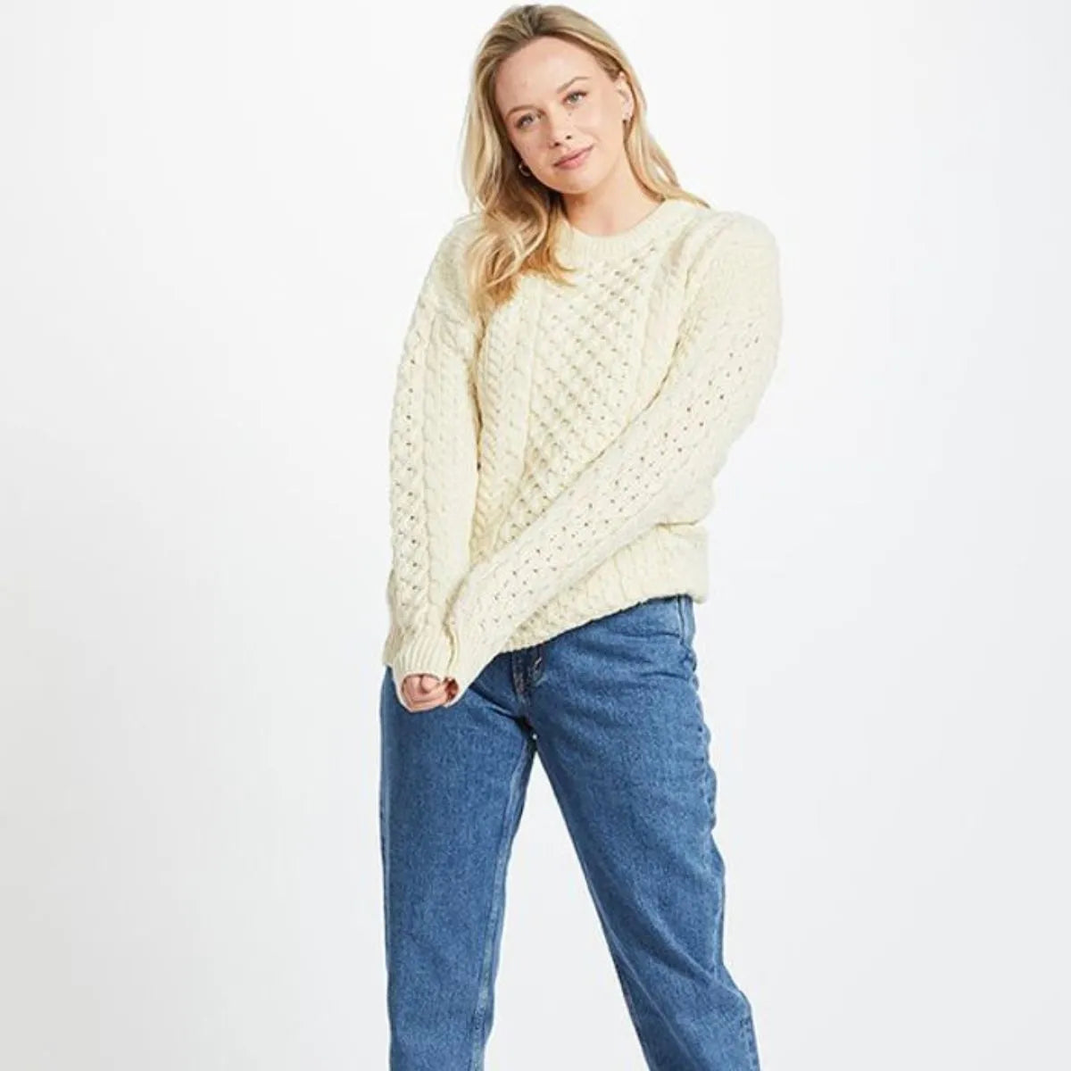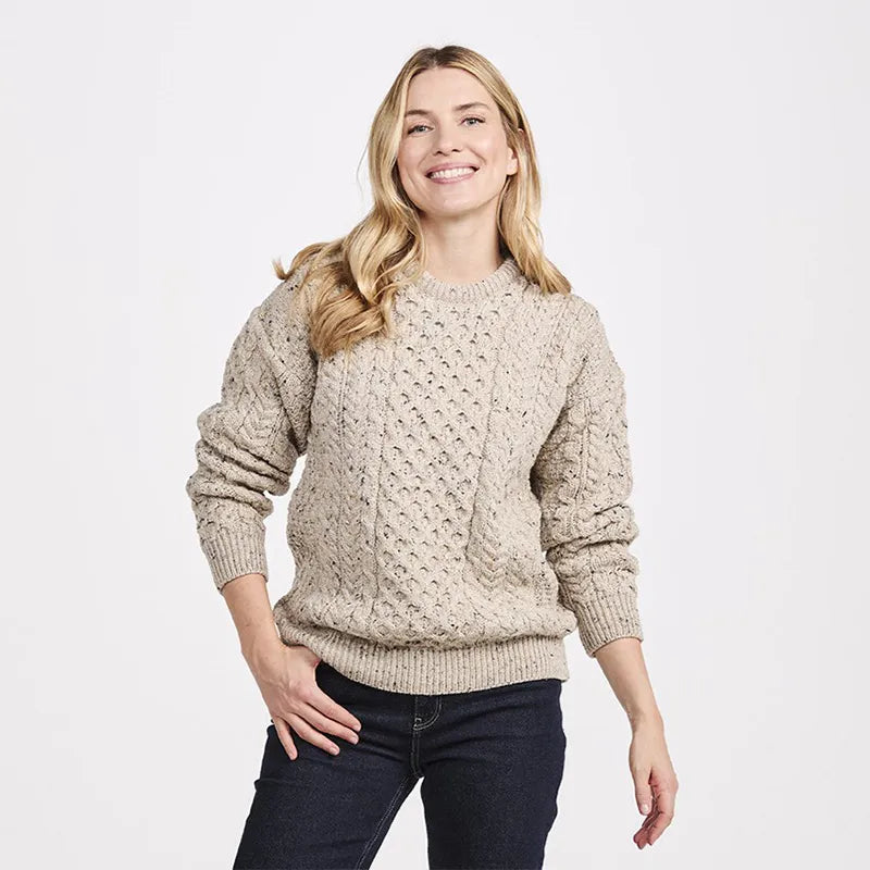 Our Women's Crew Neck Irish Fisherman Sweater will delight anyone with its exquisite coziness! It is knit of 100% Worsted wool, a warm, moisture-resistant, and durable material, making it a great layering piece when temperatures drop. A celebration of Irish knitwear, this Aran jumper incorporates an array of stitches such as cable, honeycomb, and basket. Originally, these patterns were knit by the wives of the Irish fishermen to keep them warm during their sea ventures. Besides that, these stitches were thought to bring good fortune and prosperity. With a round neck, ribbing, and oversized fit, this worsted wool sweater combines comfort with versatility - it can be styled in many ways to cater to your needs. Explore our collection of women's Irish sweaters for a variety of stylish designs made in Ireland.