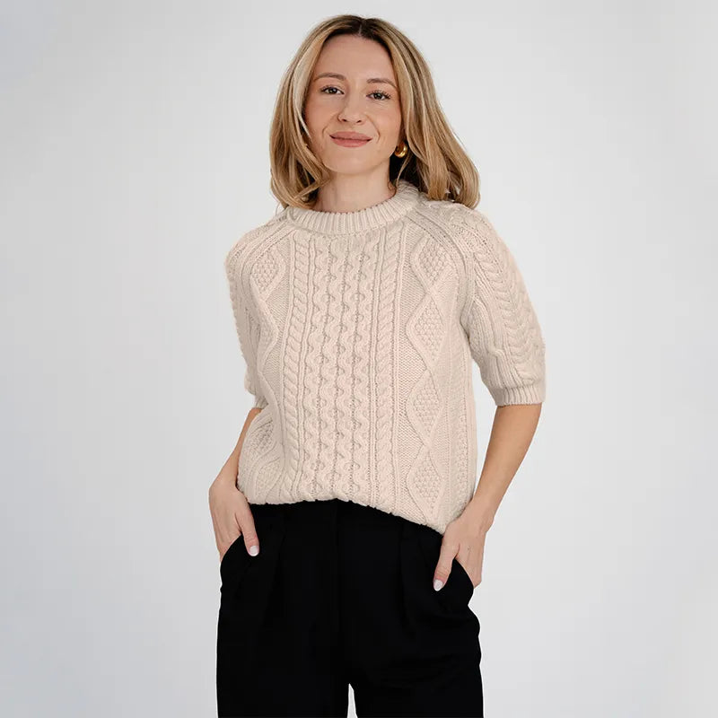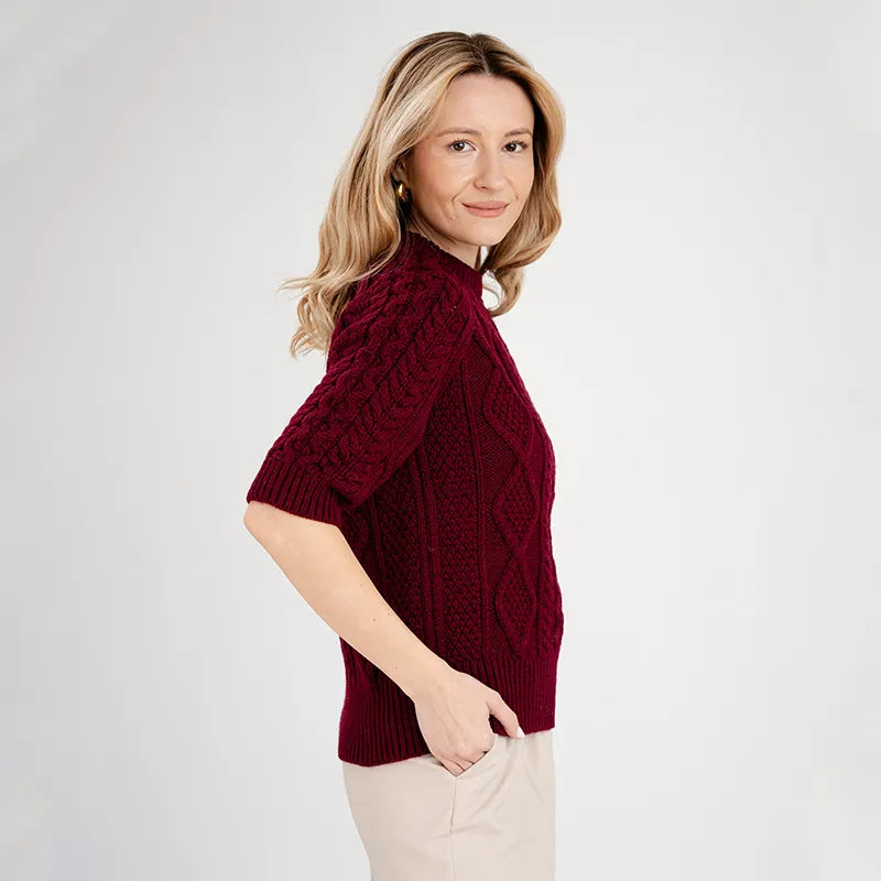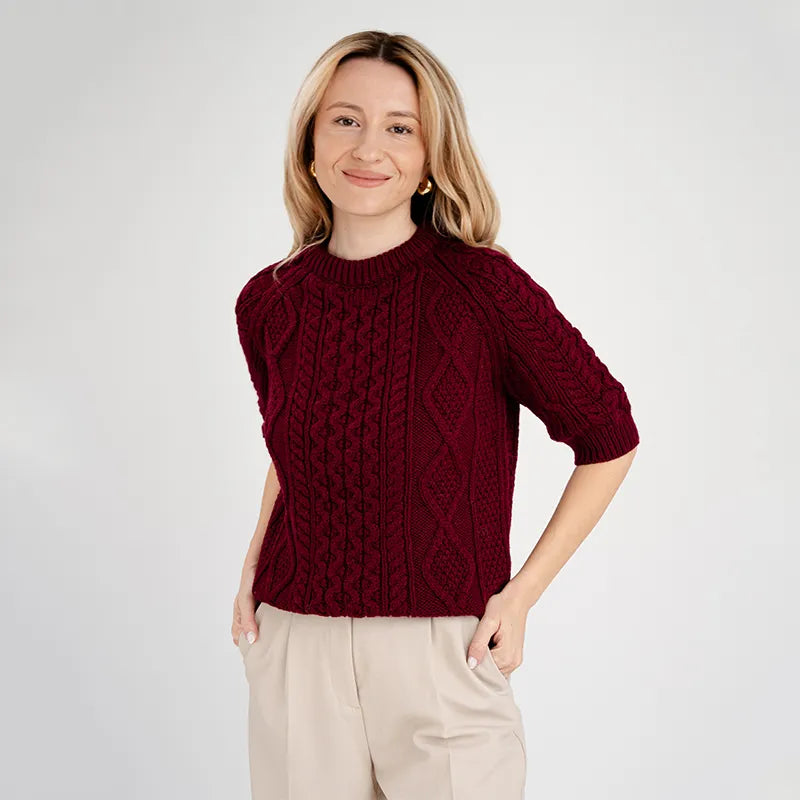 Bring a dose of Irish spirit to your closet with this Womens Short Sleeve Aran Sweater! This beautiful piece pays homage to the traditional Irish art of knitwear. It features an exquisite design, a combination of diamond, cable, and honeycomb patterns, each of them with its own meaningful symbolism. The sweater has short sleeves and a round neck. It was crafted with 100% Merino Wool, which makes it ideal for the cold season. It is warm and comfortable, being soft on the skin. It is also made in Ireland.