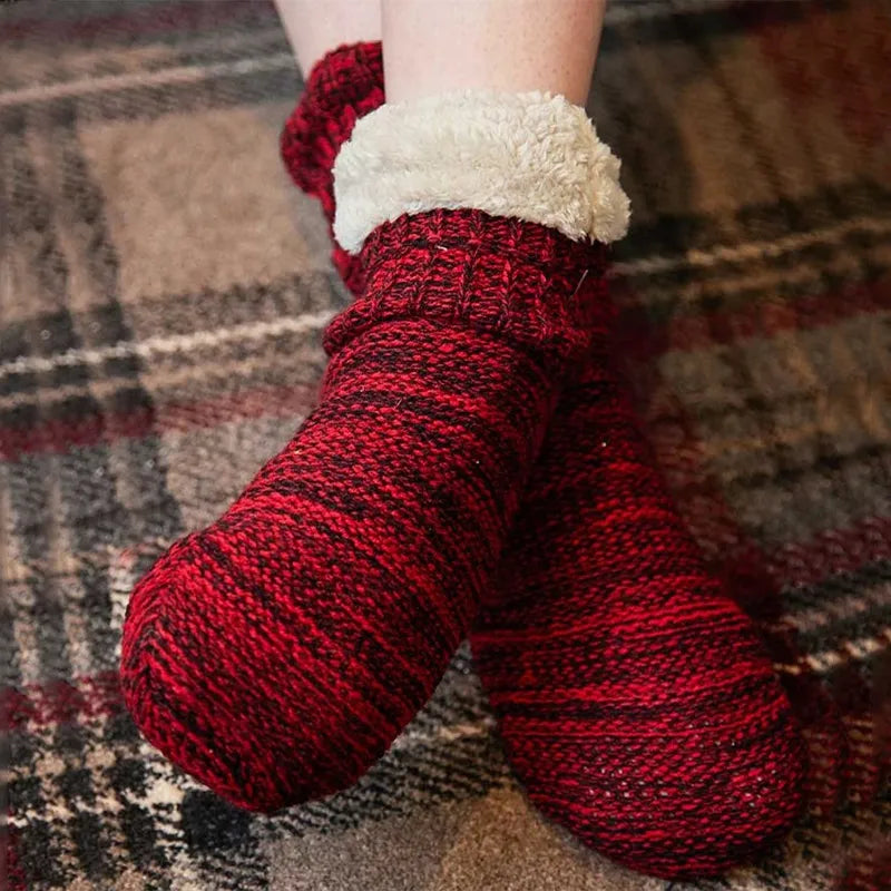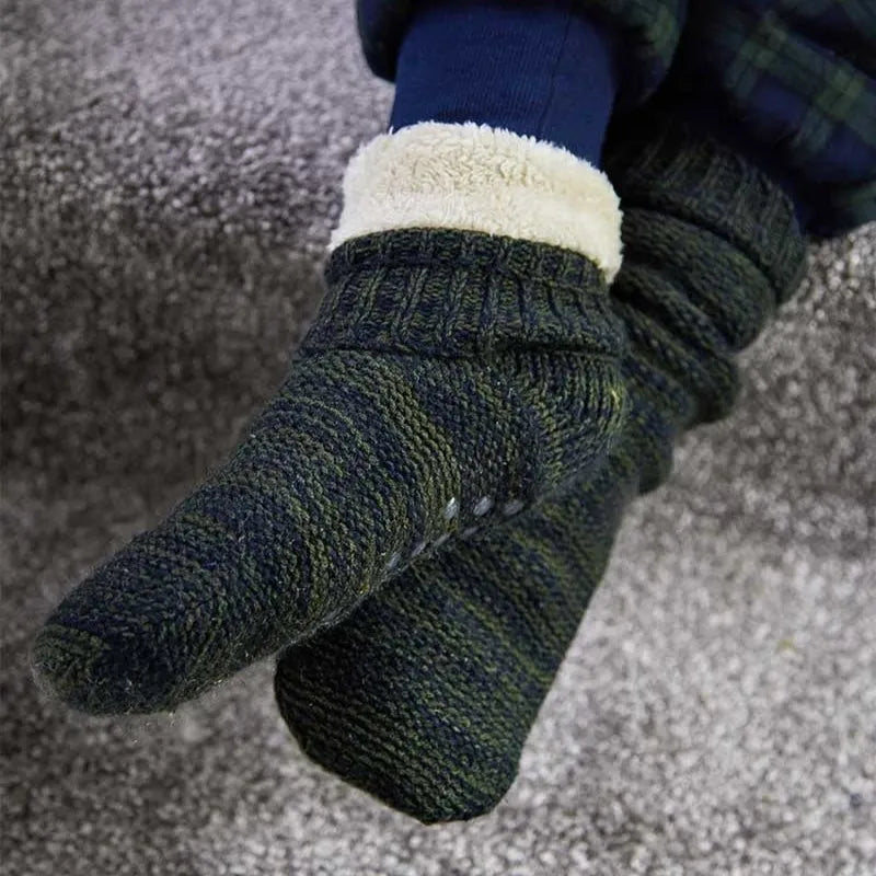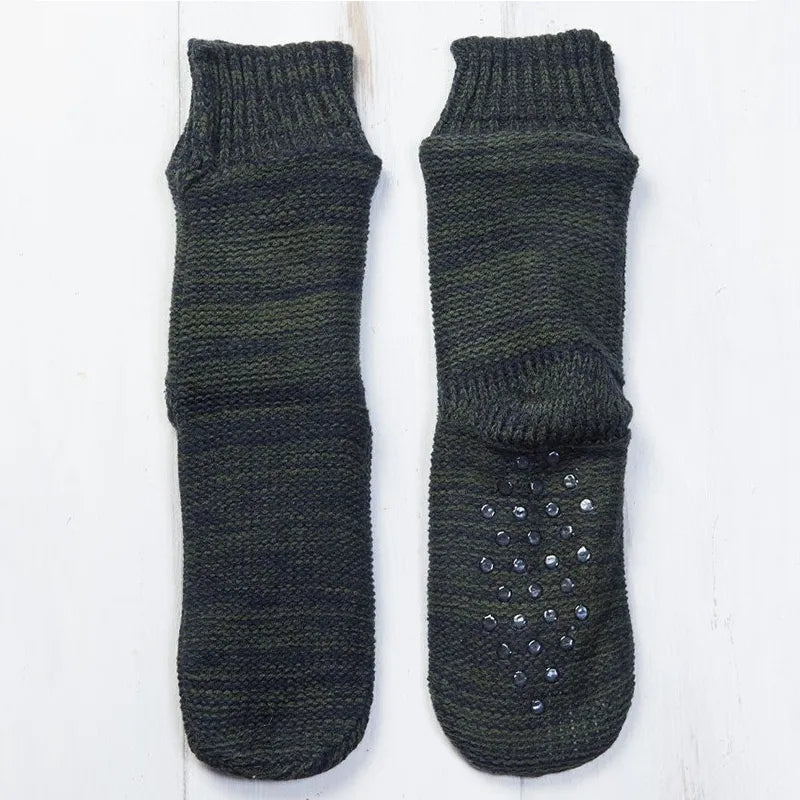 Our Fine Donegal Wool Socks - Wild Irish Blackberries are beautifully inspired by the stunning landscapes of Donegal. Each pair is a tribute to the rugged charm of Ireland's natural scenery, featuring colors that mirror the rich, earthy tones of rolling hills, and the lush greenery of the countryside, filled with dark-colored, juicy wild blackberries. Crafted from authentic Donegal wool, these socks provide natural insulation and breathability, ensuring your feet stay warm. The wool's exceptional properties allow for moisture-wicking, keeping your feet dry and comfortable throughout the day. Sourced exclusively from Donegal, this wool reflects the region's rich heritage and traditional craftsmanship, with each pair showcasing its unique character. The cozy fleece lining enhances comfort, making these socks an ideal choice for lounging around the house on chilly evenings. Whether you're curled up with a good book or enjoying a cup of tea, your feet will thank you for the extra layer of snug warmth. Safety and stability are also prioritized with lightweight dot grippers on the soles. These anti-slip features allow you to move freely around your home without worry.